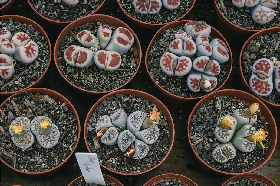 Within the succulent world, there are about 100 weird, chunky plants known as mesembs, which all mimic the appearance of rocks and