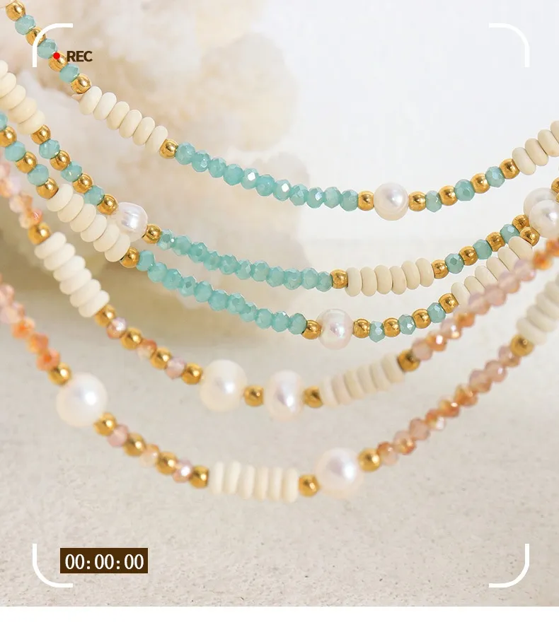 Made from titanium steel, this necklace combines durability with a lightweight design. Titanium is known for its strength and resistance to tarnishing and corrosion, ensuring that the necklace will remain in pristine condition for years to come. The smooth, polished finish of the titanium chain makes it a comfortable and stylish option for daily wear, while the glass stones and freshwater pearls provide the necessary balance of elegance.