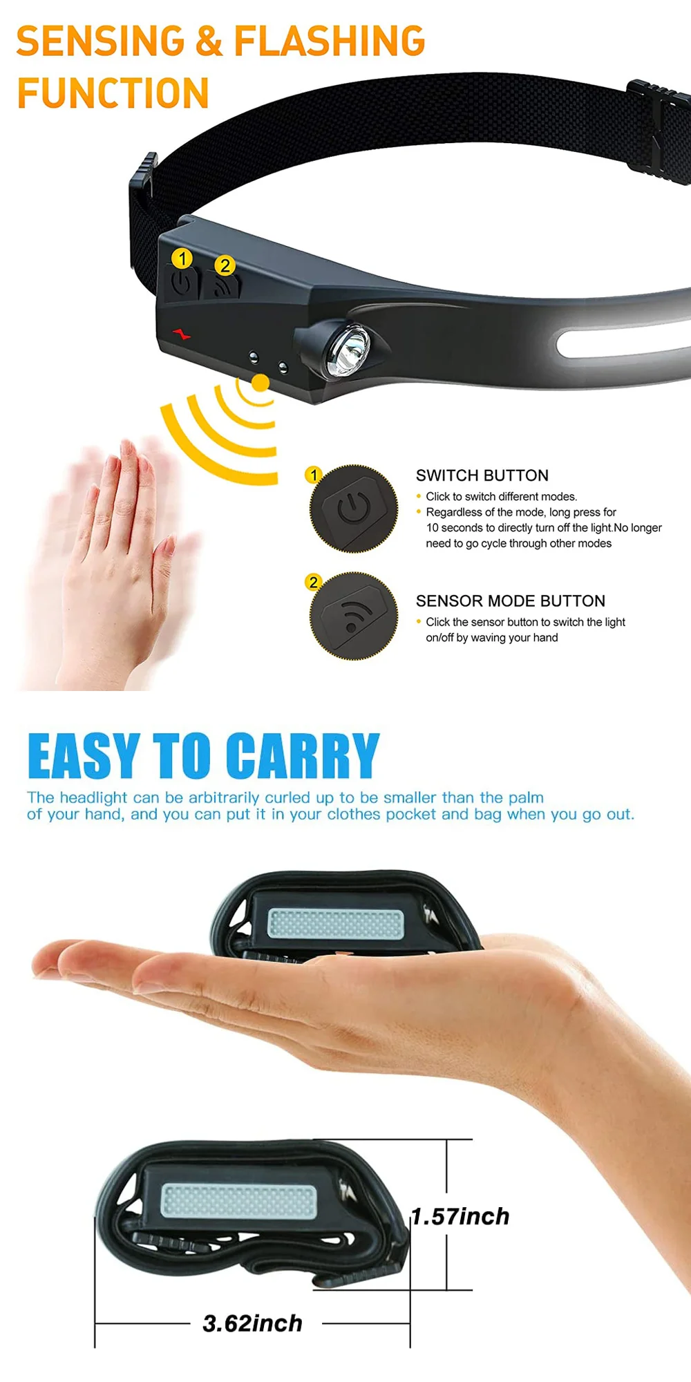 The LED Induction Headlamp features a sleek, ergonomic design that ensures comfort and stability during use. The headlamp is made from high-quality, durable materials that can withstand the rigors of outdoor activities and work environments. It includes an adjustable elastic headband that fits securely on your head, providing a comfortable and snug fit. The headlamp also has a built-in induction sensor for easy, hands-free operation.