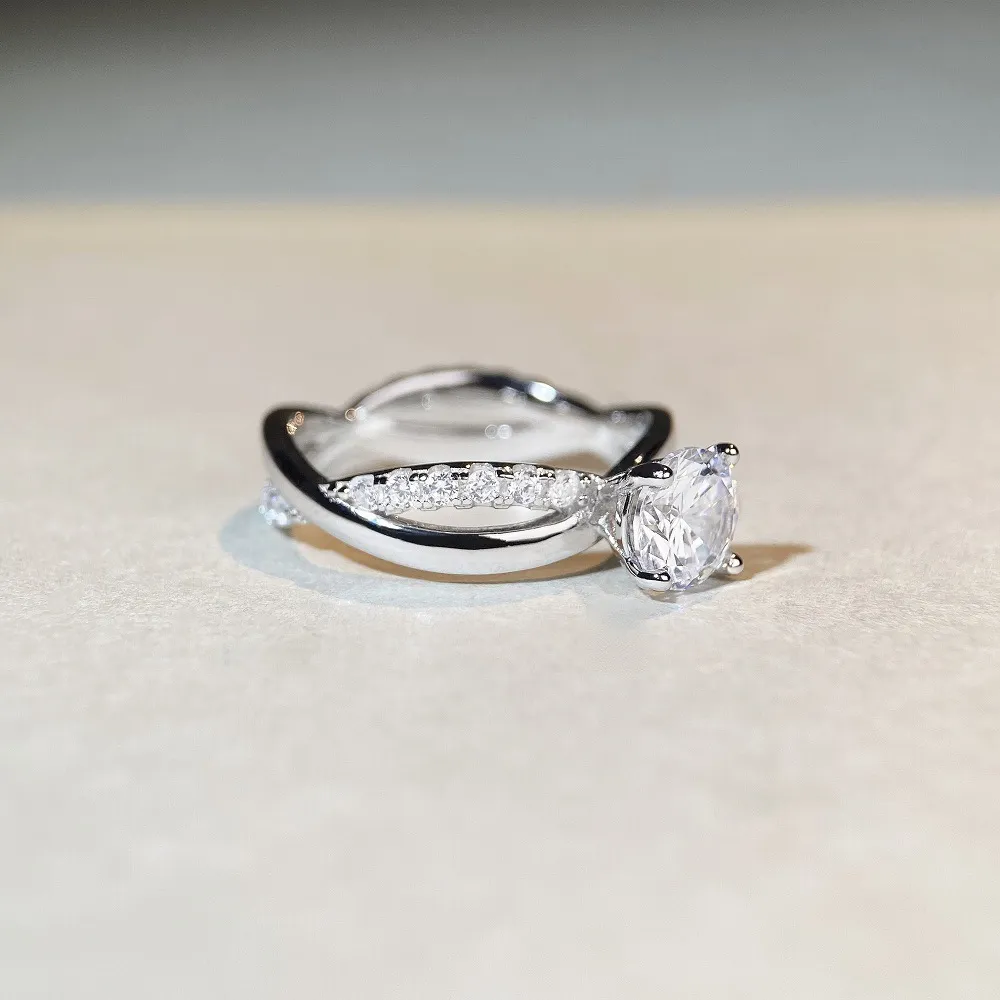 The winding band adds a modern, romantic touch, symbolising eternal love and strength. Its unique design sets it apart from traditional solitaires.