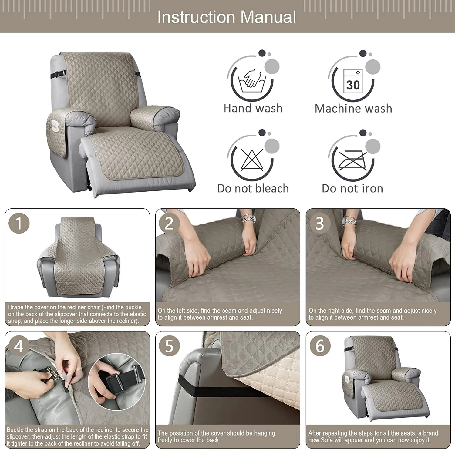 Non-Slip Design:Â The round silicone rubber backing of the recliner sofa cover is designed to make the reclining sofa slipcover more firmly stay in your sitting area. Elastic straps and non-slip buckles are included in each slipcover reclining sofa to stabilize the seat and prevent the back of the recliner from slipping off.