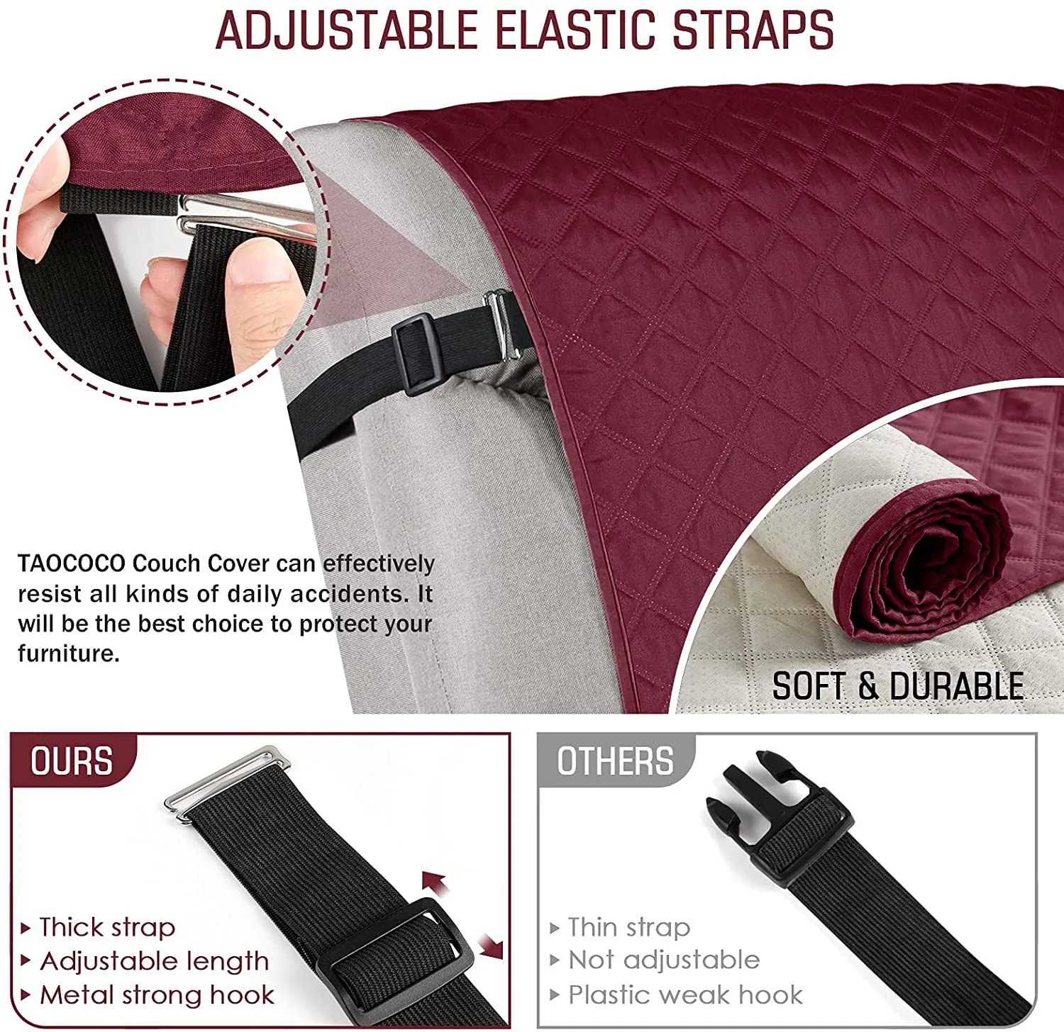 After extensive market research, we have added straps to the back of the couch covers with round buckle, which prevent the covers from
