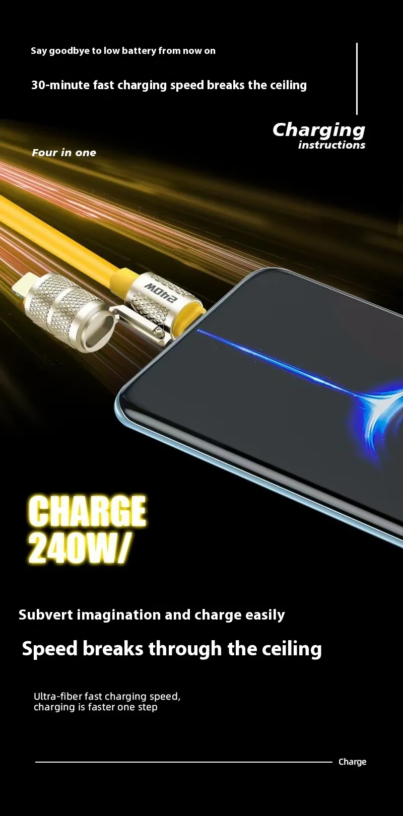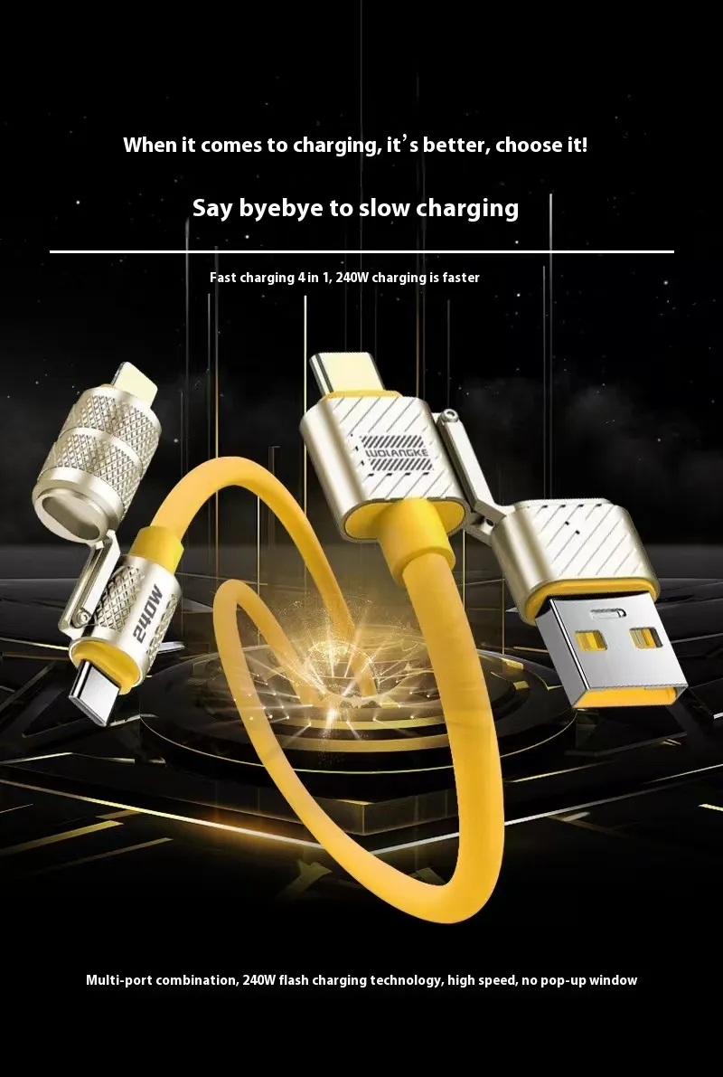 This innovative cable features a four-in-one interface, including dual Type-C connectors and multiple device compatibility. Switch easily between devices without the need for multiple cables, offering convenience for charging smartphones, tablets, laptops, and other electronic devices.