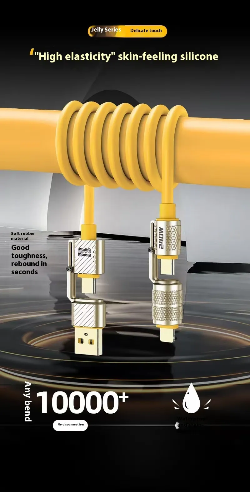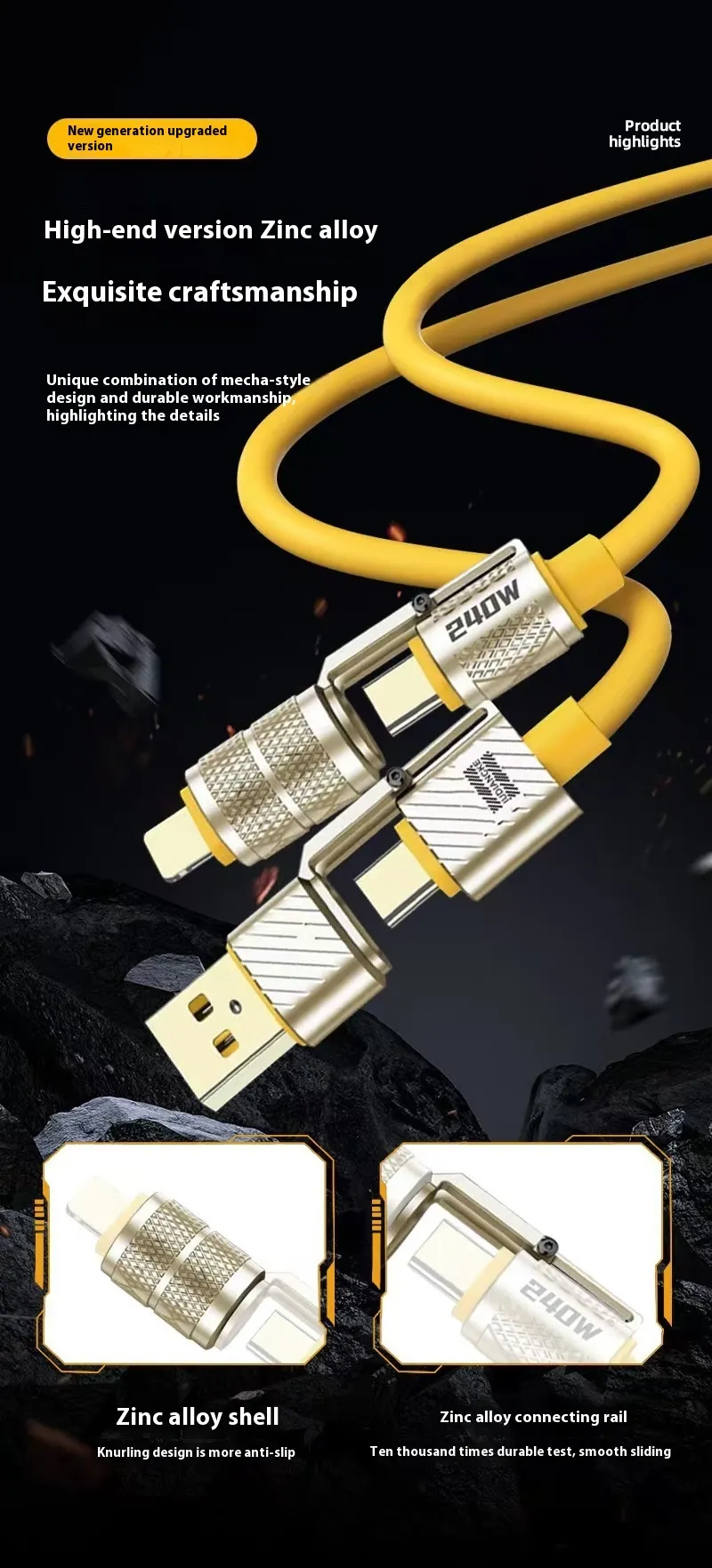 The cable connectors are made from premium zinc alloy, providing exceptional durability and resistance to wear and tear. The bold silicone exterior adds flexibility, tangle-resistance, and long-lasting performance, making it a reliable charging solution for daily use.