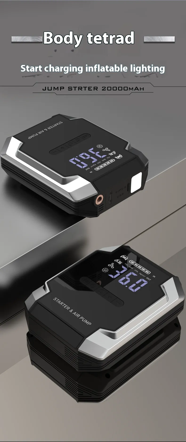 Ensure you're never stranded with a dead battery or low tire pressure with the 12V Automobile Emergency Start Power Source with Inflatable Function. This multi-functional device provides reliable power to jump-start your vehicle while also serving as an air compressor to inflate tires and other inflatables. Designed for convenience, safety, and efficiency, this power source is a must-have for every vehicle owner.
