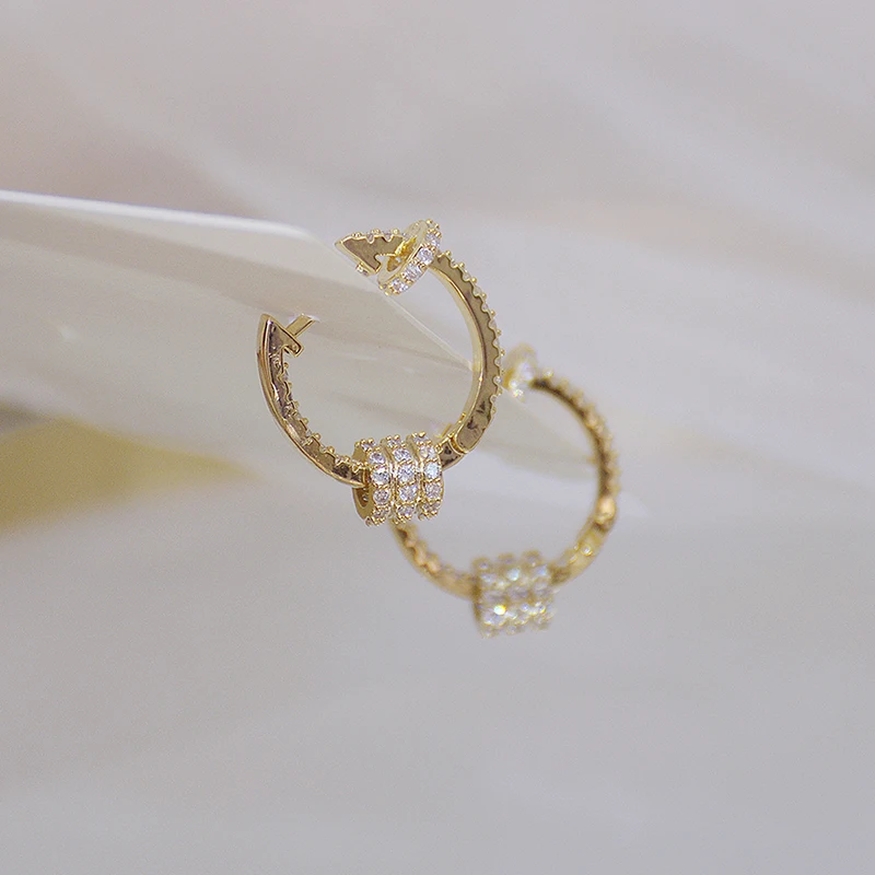 The delicate design of these earrings makes them both sophisticated and timeless. The zircon stones are set in a circular shape, surrounded by a shimmering gold-plated buckle setting that adds an extra layer of luxury and charm. The combination of gold and zircon creates a stunning contrast that is subtle yet captivating, making these earrings a perfect accessory for any occasion.