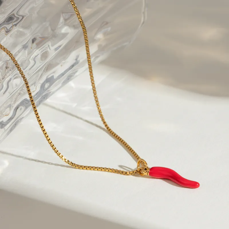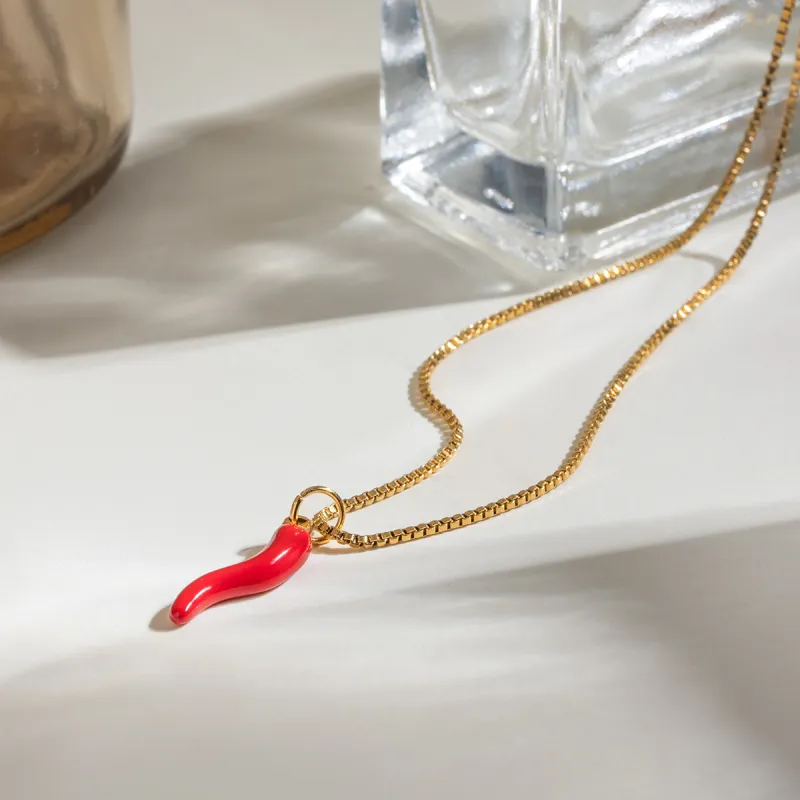 The 18K Gold-Plated Stainless Steel Necklace with Double Enamel Chili Pepper Pendant is more than just a piece of jewelry; it's a statement. With its bold design, exquisite craftsmanship, and versatile style, it's sure to become a favorite accessory for anyone looking to enhance their wardrobe with something truly special. Add this spicy and stylish necklace to your collection and let your fashion sense sizzle!