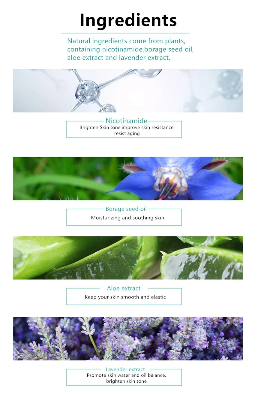 (1) Nicotinamide: brighten skin tone, improve skin resistance, resist aging (2) Borage seed oil: moisturizing and soothing skin (3) Aloe extract: keep your skin smooth and elastic (4) Lavender extract: promote skin water and oil balance, brighten skin tone