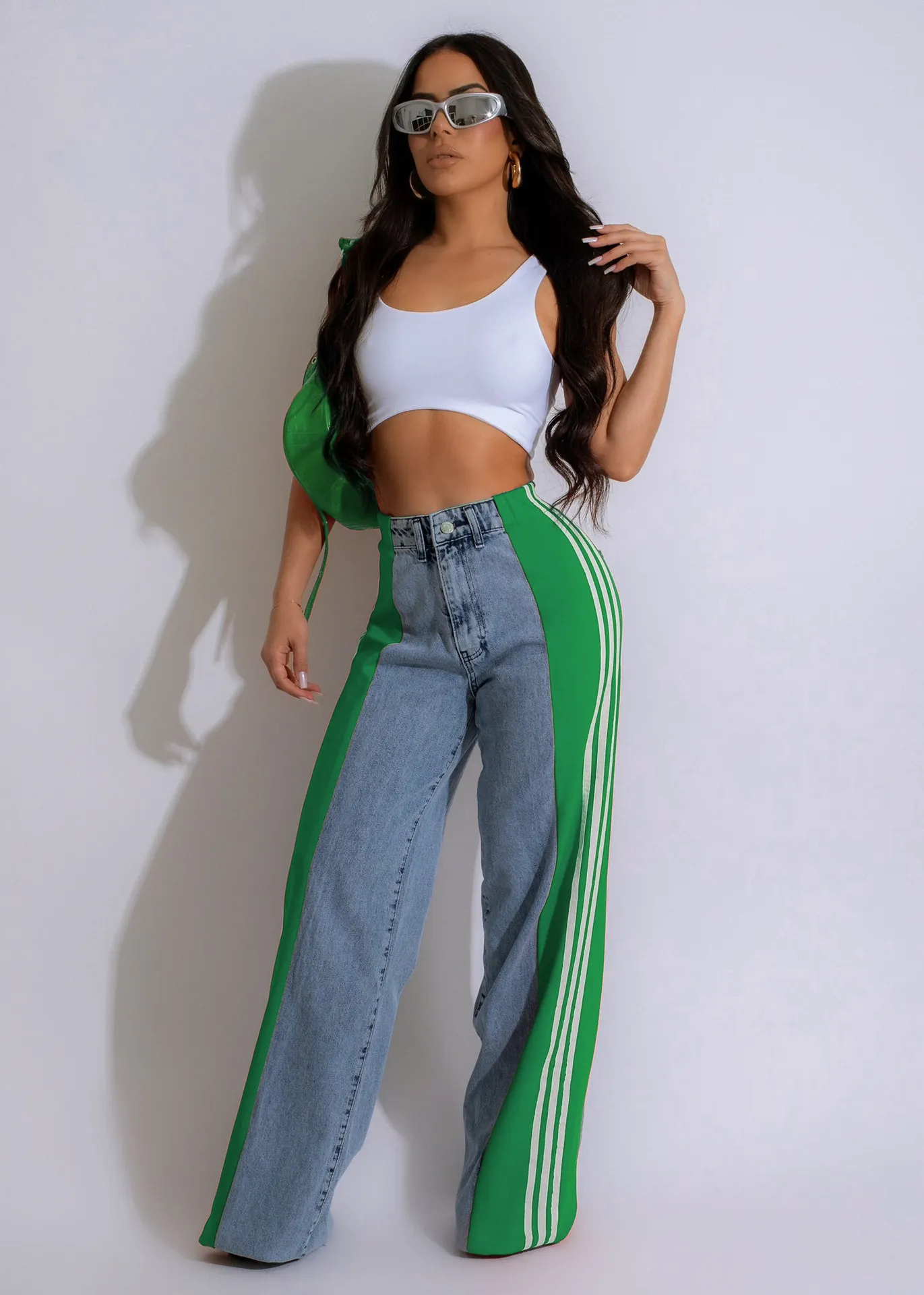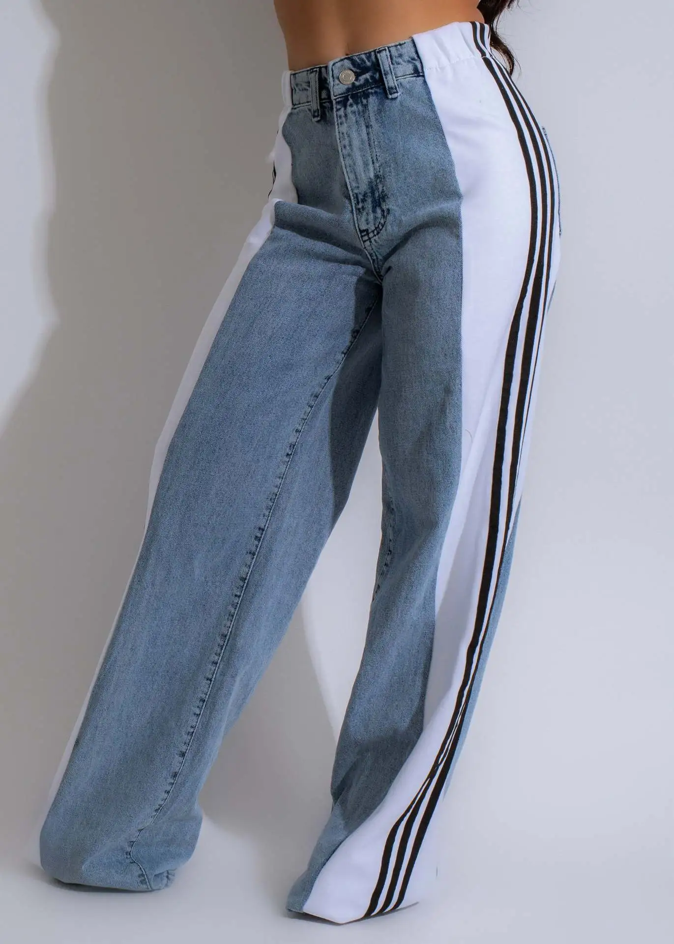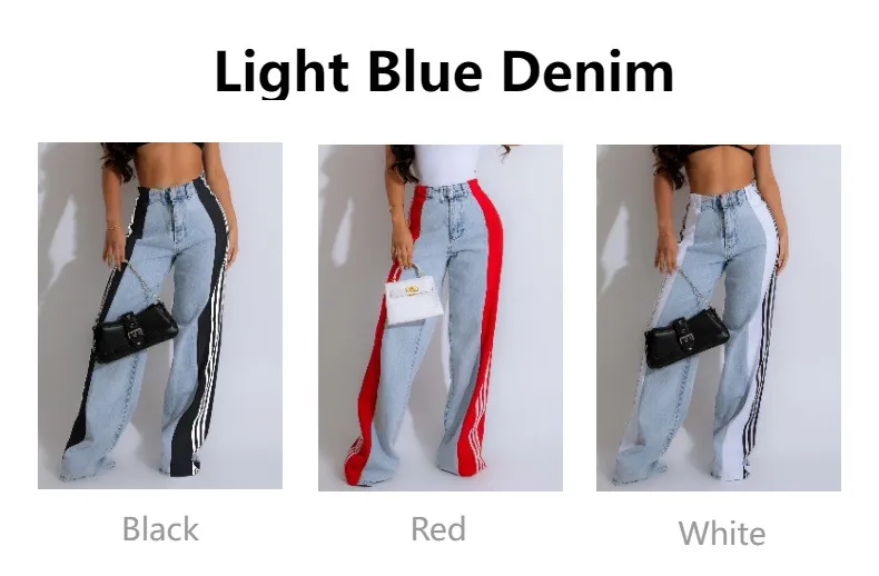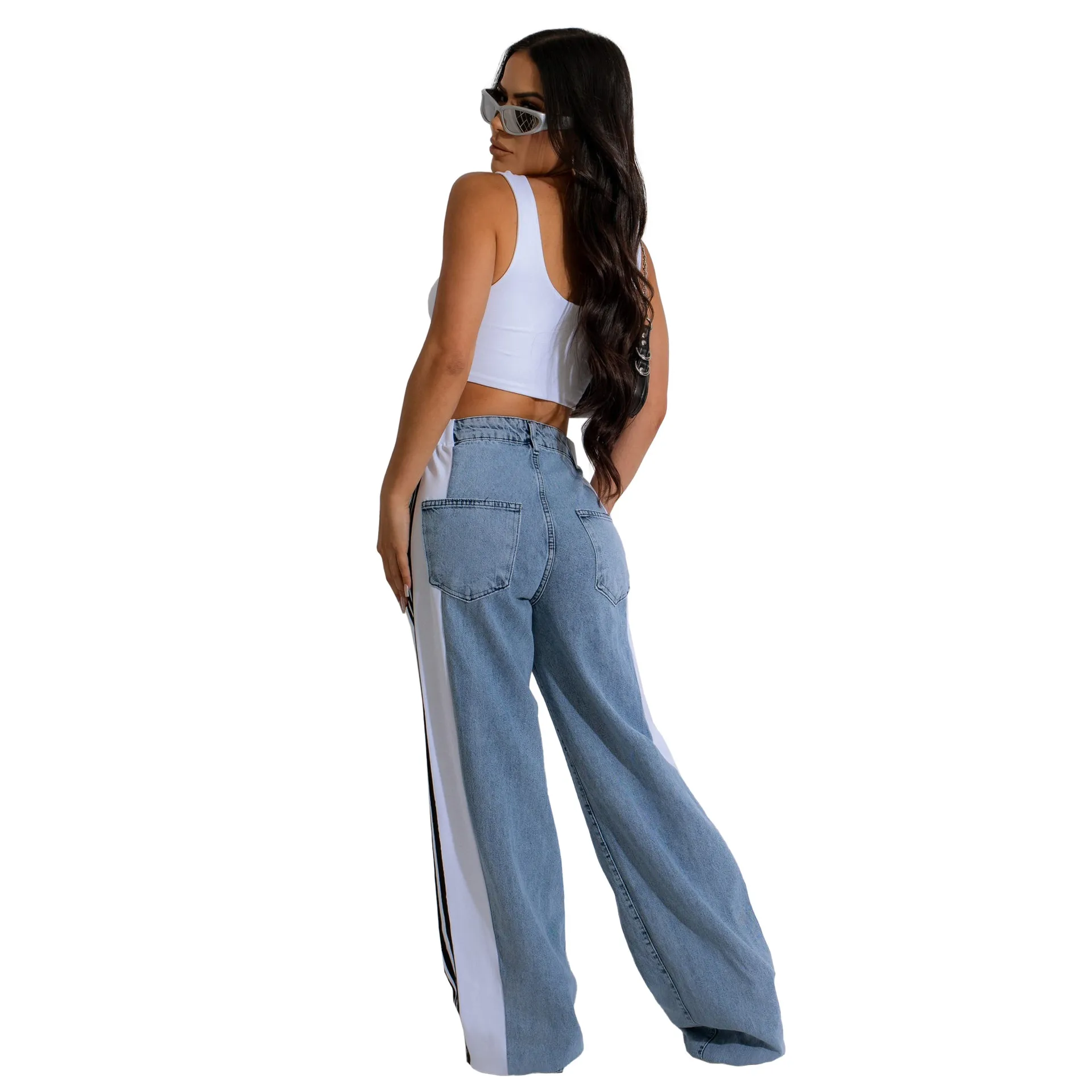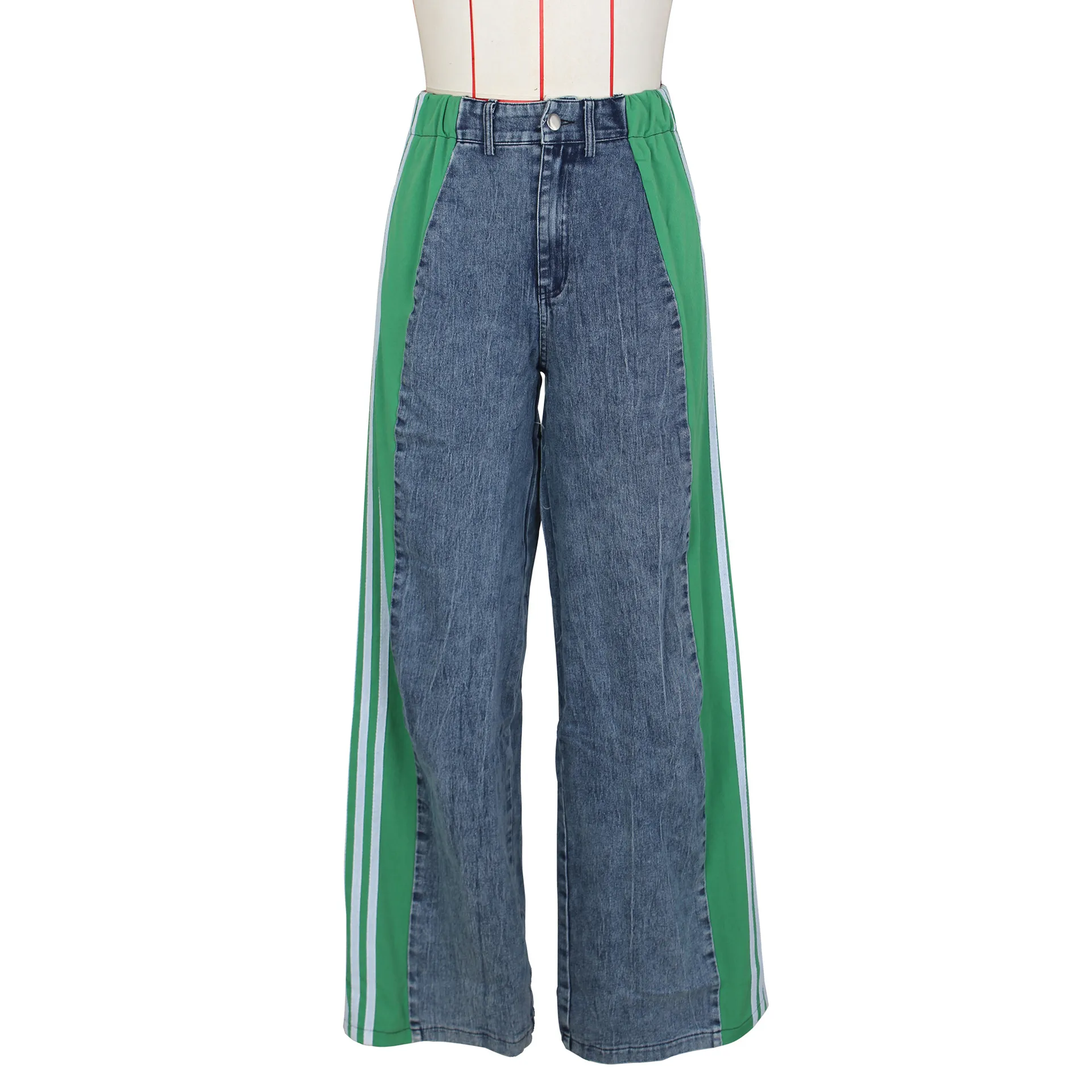 2024 Fashion Casual High Waist Elastic Straight Leg Trousers Three Stripe Patchwork Denim Wide Leg Pants Streetwear
