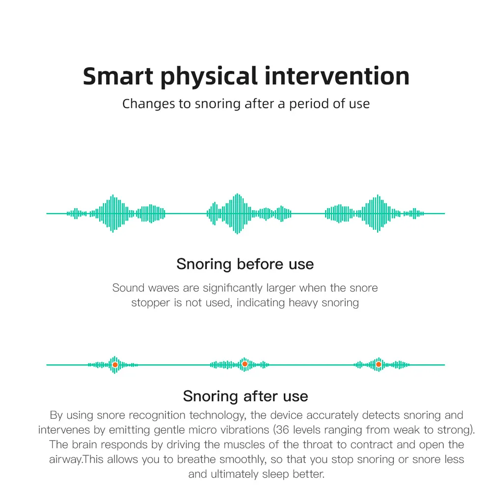 The device uses advanced sensors to detect the sound and vibration of snoring as it occurs. Once snoring is detected, the device activates a gentle vibration, which helps to encourage the wearer to adjust their sleeping position or stop snoring naturally. This approach is safe, non-invasive, and effective at addressing snoring issues without the need for uncomfortable mouthpieces or intrusive devices.