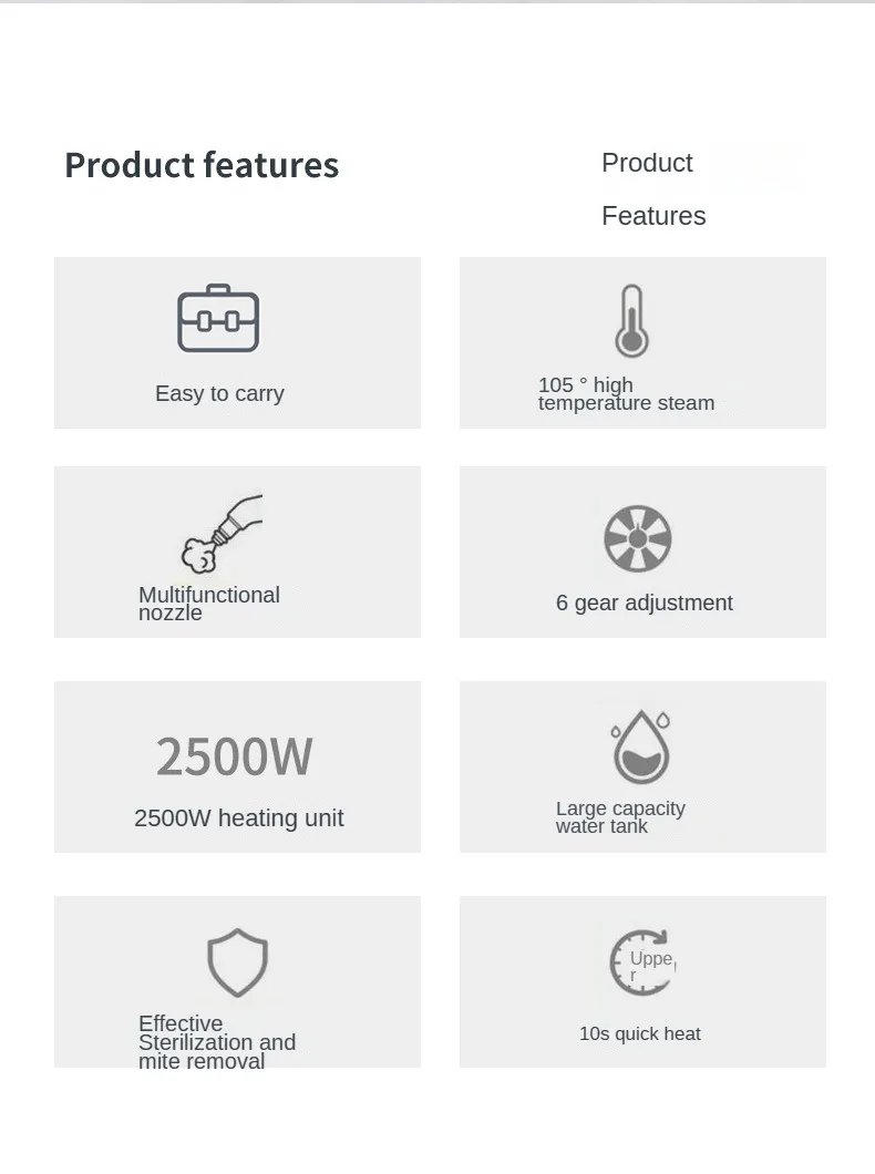 The 2500W High-Temperature Steam Cleaner combines power, versatility, and safety, making it an essential tool for modern cleaning needs. With its high-temperature steam output, eco-friendly operation, and targeted jet nozzle, this cleaner effectively removes dirt and grime from various surfaces, ensuring a sanitized and spotless result. Perfect for kitchens, vehicles, bathrooms, and more, it offers a convenient, chemical-free cleaning solution that keeps your environment fresh and clean.