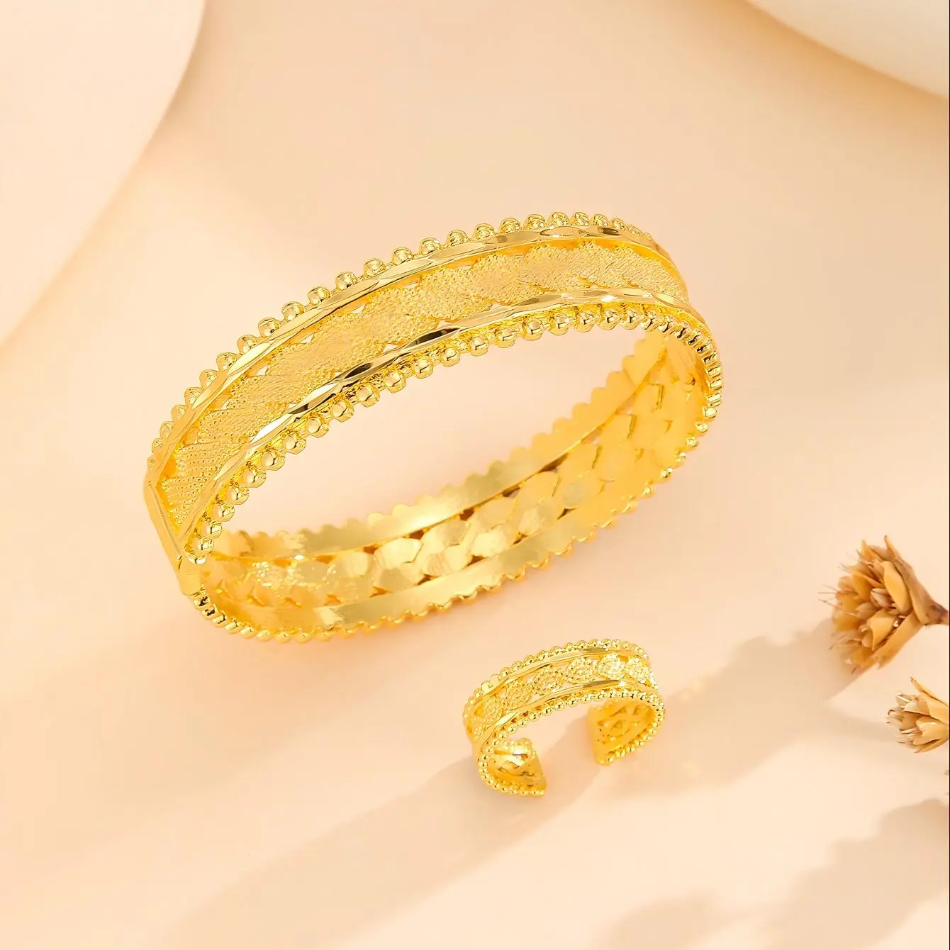 2pcs Vintage Gold Plated Bracelet, Open Bracelet Ring Jewelry, Women's Festival Wedding Jewelry Set