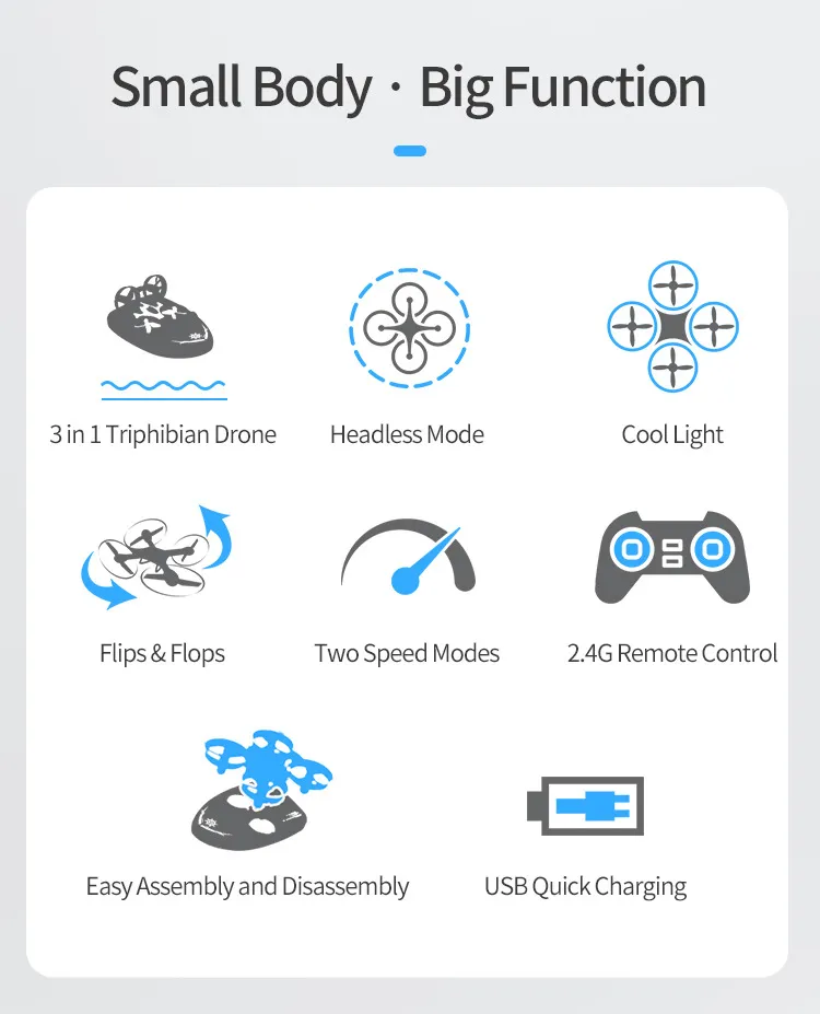 Equipped with one-button takeoff/landing and altitude hold, the drone ensures smooth and stable flights, even for beginners. Its land mode transforms it into a mini race car, while water mode allows it to float and move across the water's surface, adding an extra dimension to outdoor fun. LED lights enhance visibility during night flying, and 360-degree flips bring dynamic action to every session.