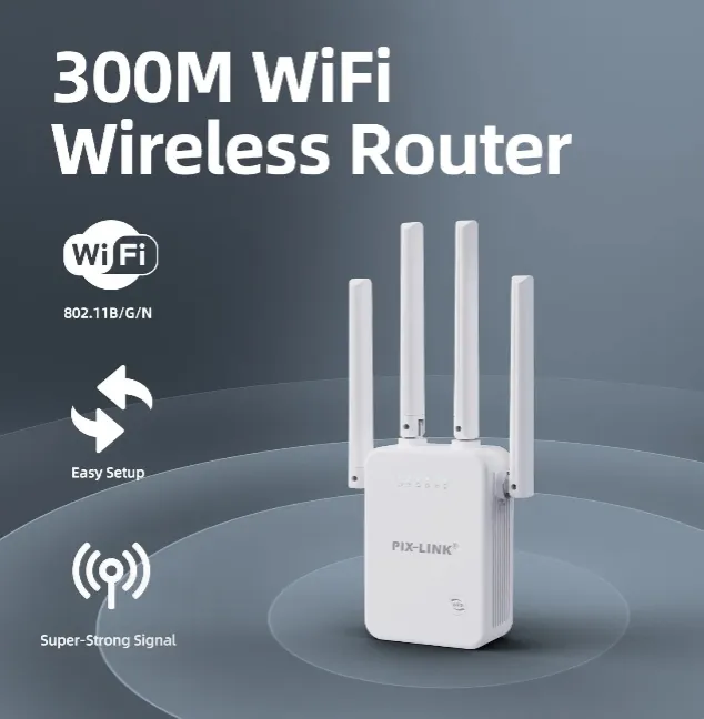 The PIX-LINK Wi-Fi Range Extender boosts your wireless network coverage and eliminates dead zones in your home or office. With four high-gain antennas and up to 300Mbps speed, it ensures a stable, high-speed connection across multiple devices. Designed for easy plug-and-play setup, this extender is perfect for streaming, gaming, and working from anywhere in your space.