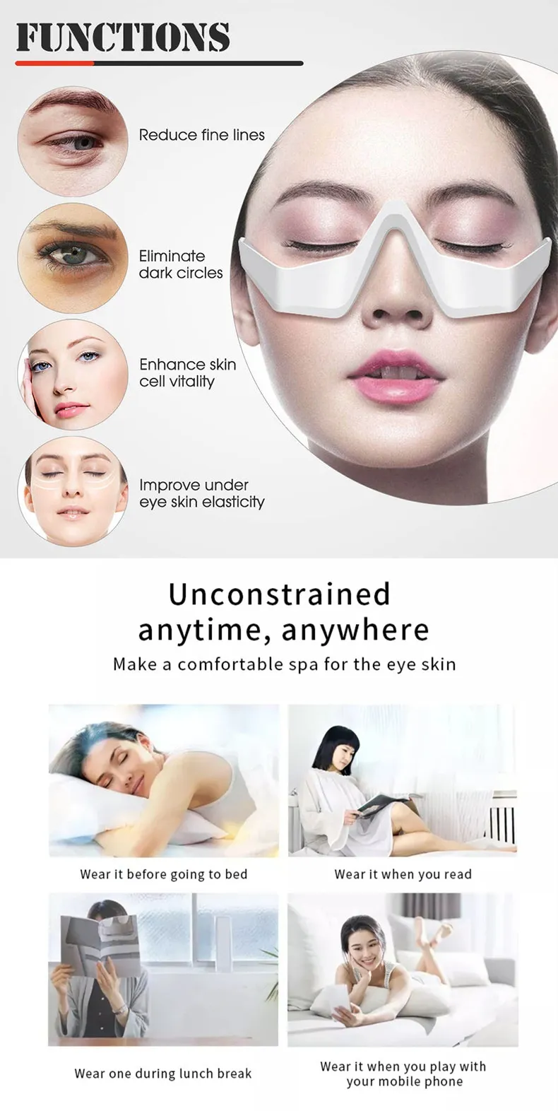 By combining red light therapy, EMS micro-stimulation, and ergonomic 3D massage design, this device provides a comprehensive approach to eye area care without the need for clinic visits or complex treatments.