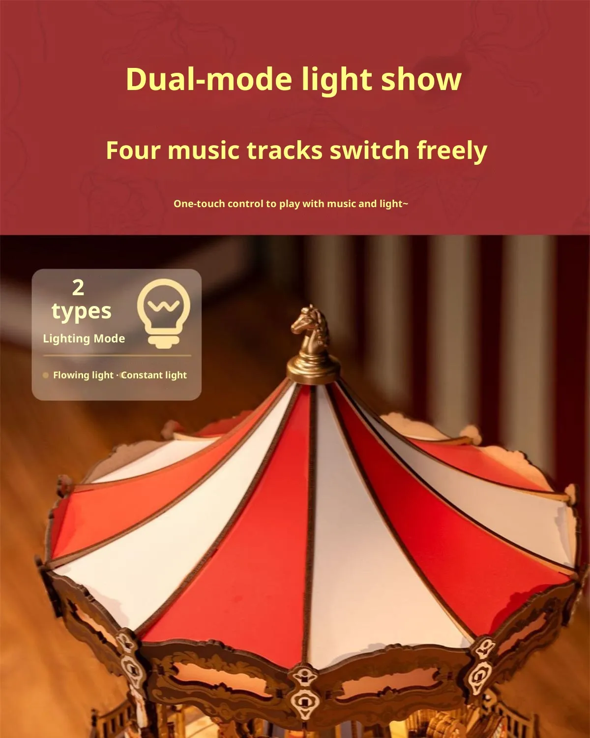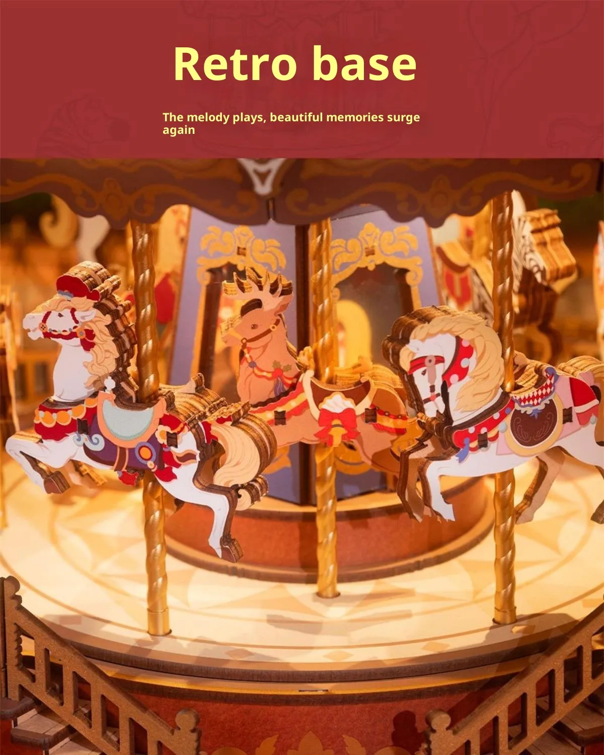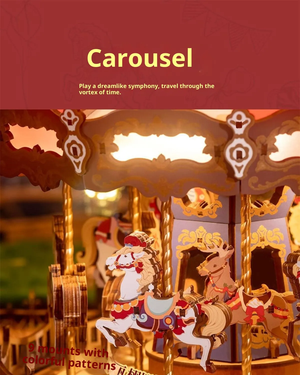The carousel design features classic proportions and decorative detailing that reflect timeless amusement park aesthetics. Once completed, the model stands as an attractive display piece suitable for shelves, desks, side tables, or display cabinets. It blends naturally into home décor, children’s rooms, offices, and creative spaces.