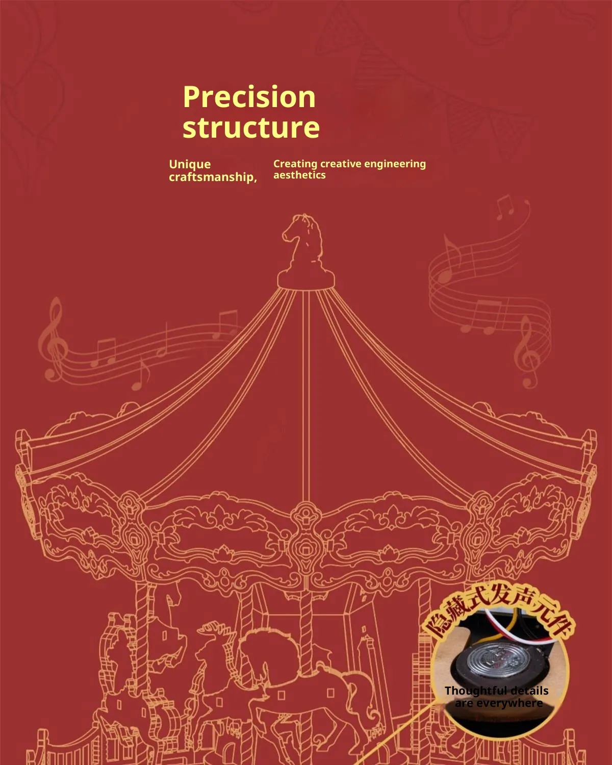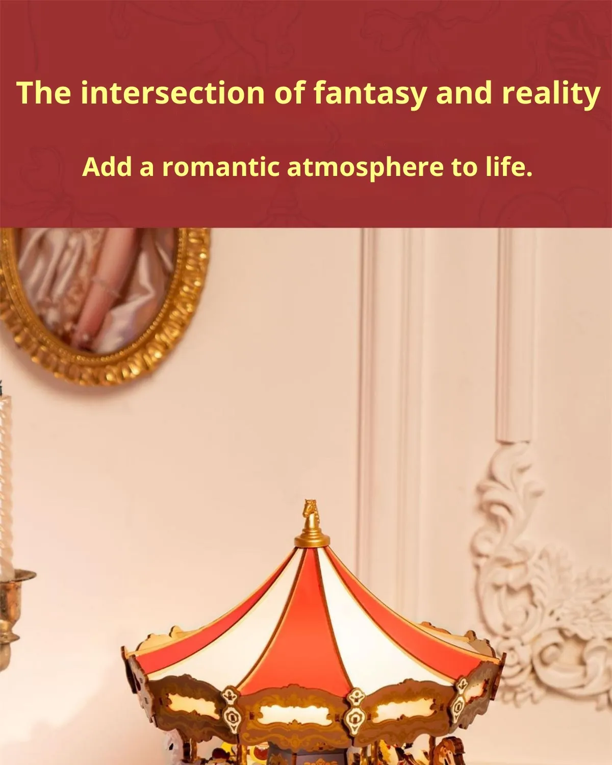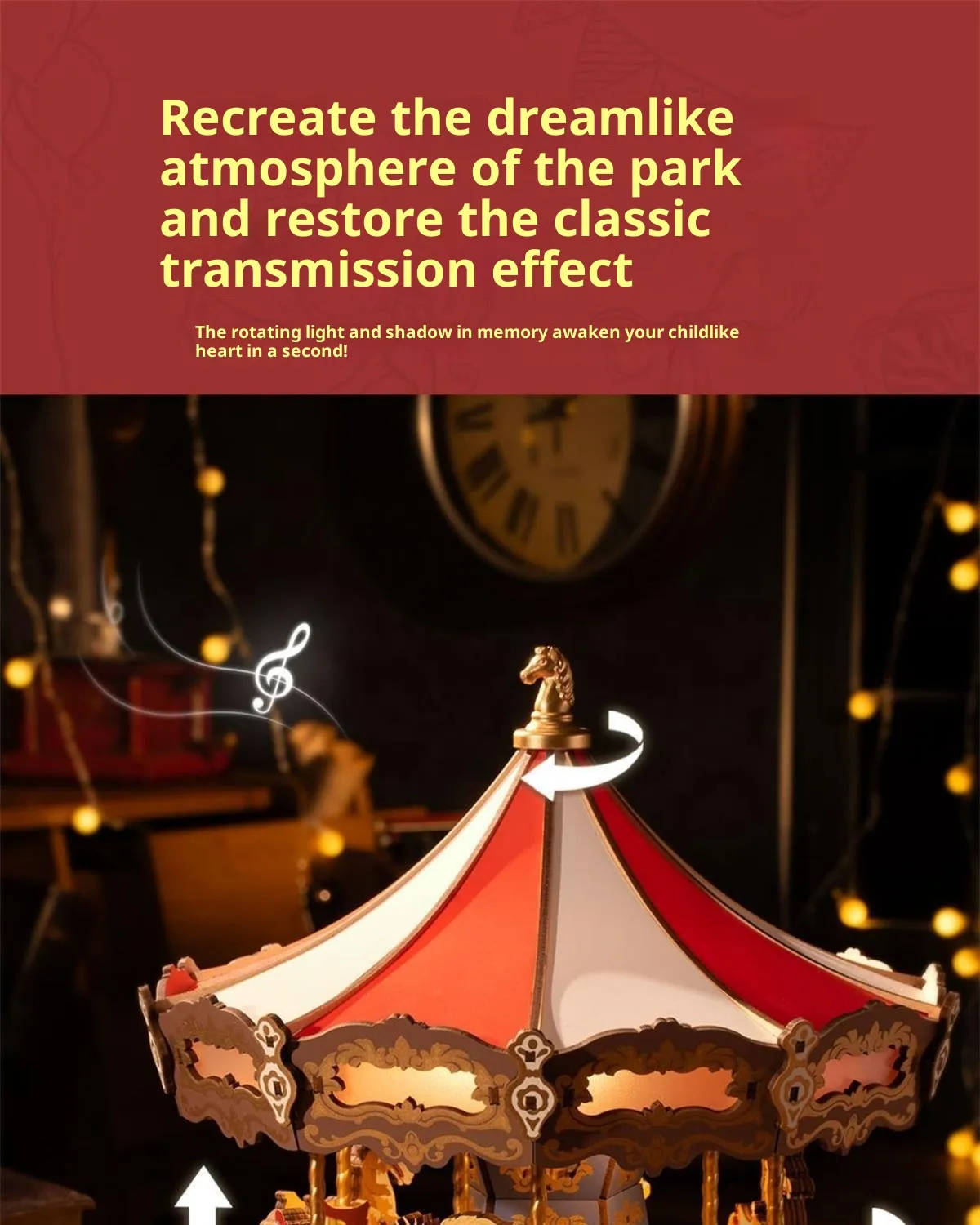 The carousel design features classic proportions and decorative detailing that reflect timeless amusement park aesthetics. Once completed, the model stands as an attractive display piece suitable for shelves, desks, side tables, or display cabinets. It blends naturally into home décor, children’s rooms, offices, and creative spaces.