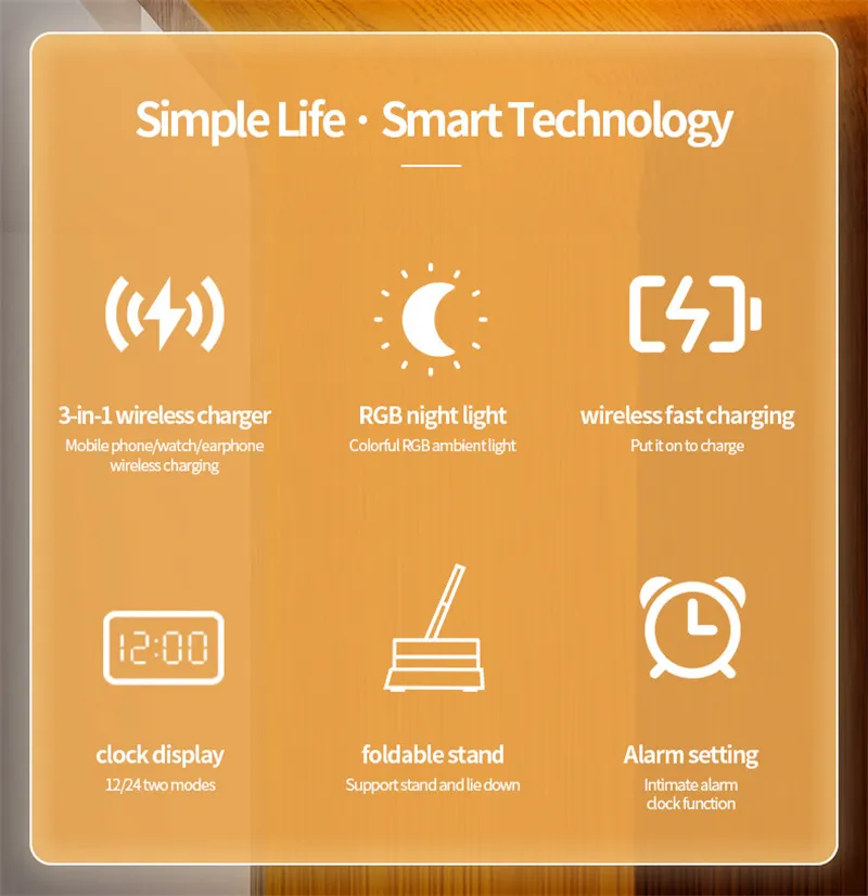 The 4 in 1 multifunction wireless charger station is a cutting-edge device designed to streamline your bedside or desk setup. Combining wireless charging for multiple devices, an alarm clock display, a foldable stand, and an RGB night light, this all-in-one gadget offers convenience and style for modern living.