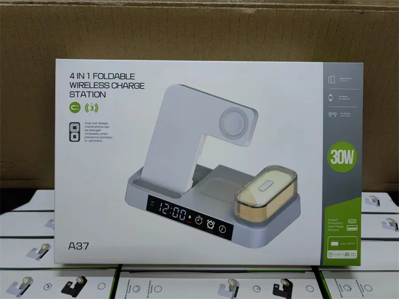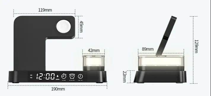 The 4 in 1 multifunction wireless charger station is a cutting-edge device designed to streamline your bedside or desk setup. Combining wireless charging for multiple devices, an alarm clock display, a foldable stand, and an RGB night light, this all-in-one gadget offers convenience and style for modern living.