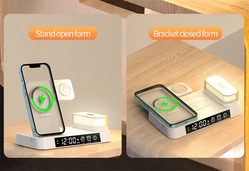 4 In 1 Multifunction Wireless Charger Station With Alarm Clock Display Foldable Wireless Charger Stand With RGB Night Light