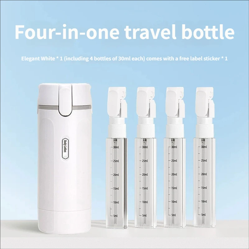 This innovative set combines four travel bottles into one compact unit, perfect for storing shampoo, conditioner, body wash, and lotion for your on-the-go needs.