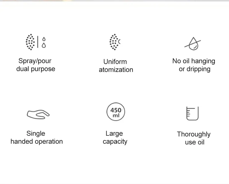 2. Upgrade Nozzle Design:Â Our oil sprayer for cooking features a cleverly designed nozzle that provides excellent control over the oil distribution. Simply press the spray button for a fine mist or lightly press for a steady stream. Enjoy precise and effortless oil application, ensuring an even coating on your dishes or pans.