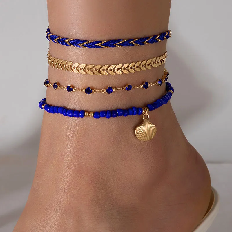 4pcs Set Bohemian Woven Rope Foot Chain For Men And Women Geometric Alloy Black Beads Dropping Oil Anklet Set Summer Fashion Jewelry