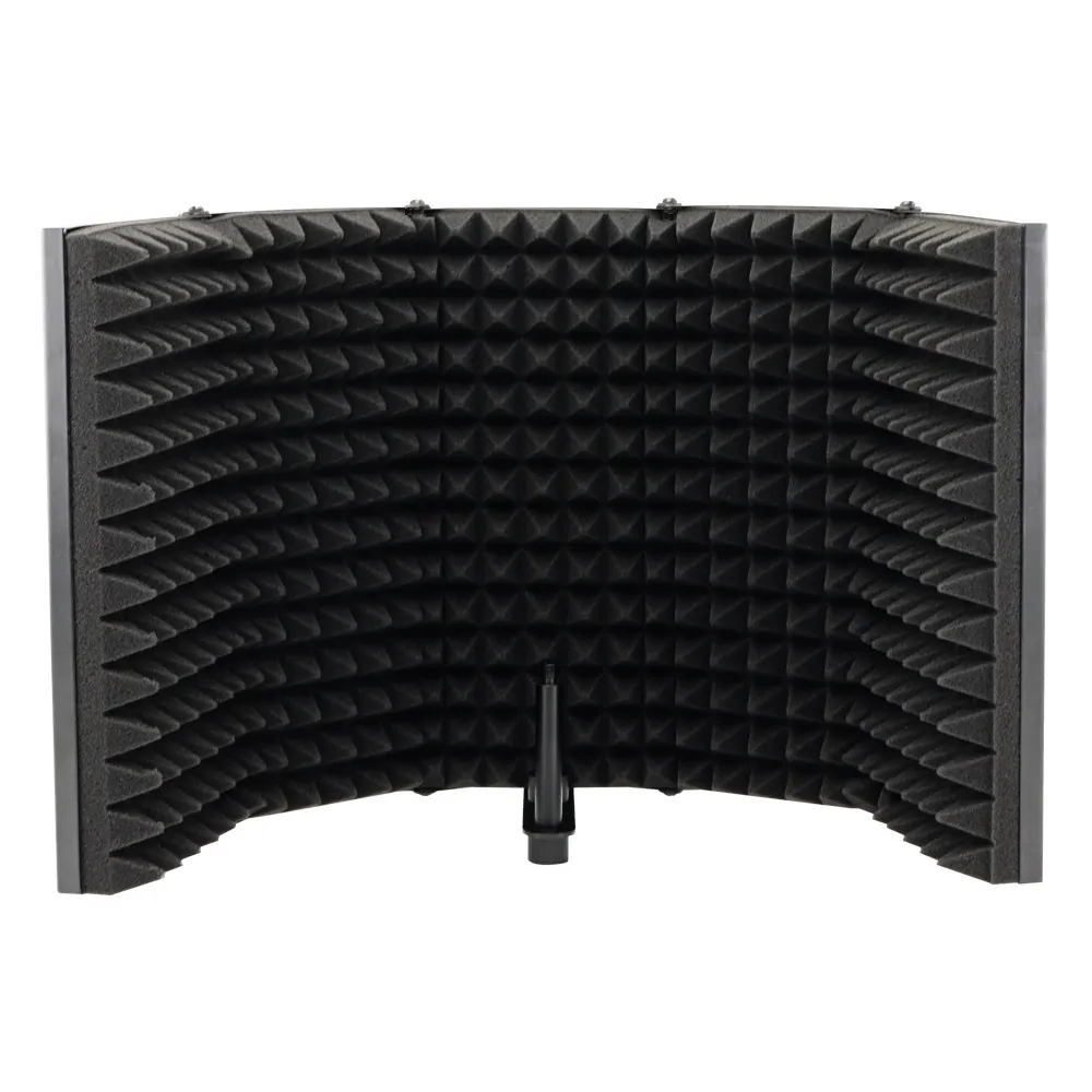 Foldable and adjustable. It can be mounted on the right microphone stand or boom.