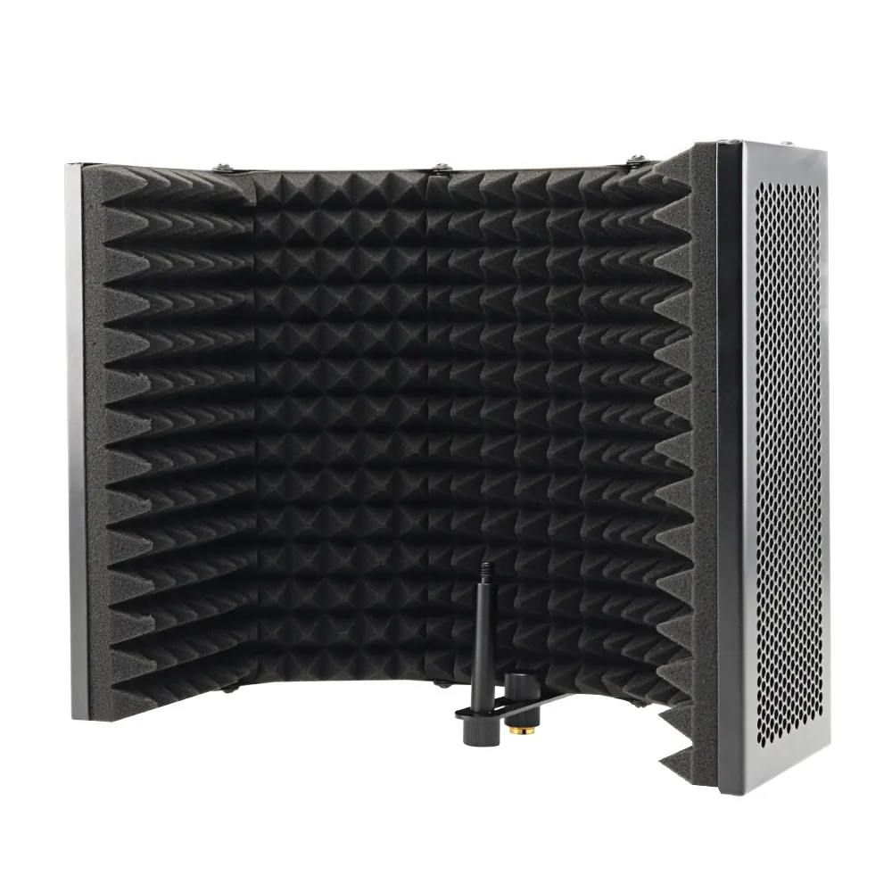 Foldable and adjustable. It can be mounted on the right microphone stand or boom.