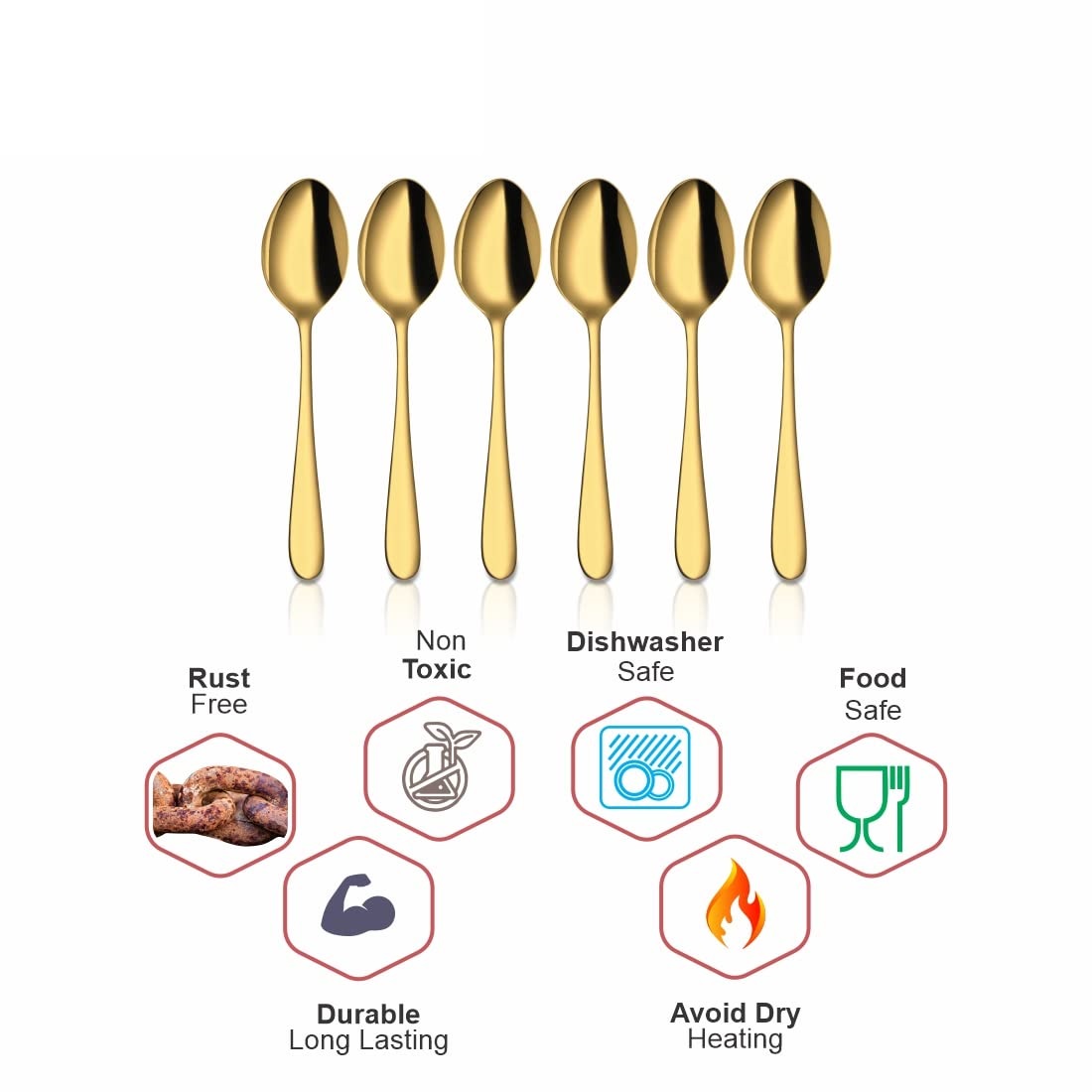 Durability meets sophistication in this 6-piece set. Each spoon is forged from premium stainless steel, ensuring a strong and sturdy utensil that is resistant to rust, corrosion, and tarnishing. The gold plating is applied with precision, resulting in a smooth, reflective surface that not only dazzles visually but also provides an easy-to-clean, low-maintenance utensil. Built to withstand the rigors of daily use, these spoons are a reliable and elegant addition to any cutlery collection, promising to retain their luster and beauty for years to come.