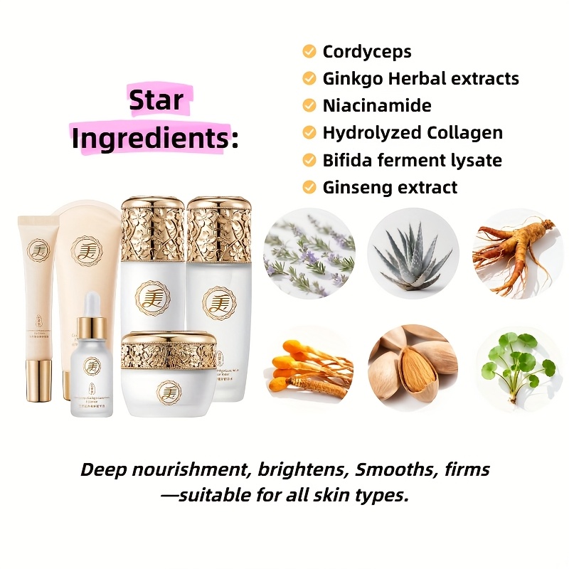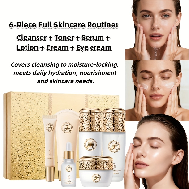 Complete 6-Step Routine: Cleanser, Toner, Eye Cream, Serum, Lotion, Cream.
