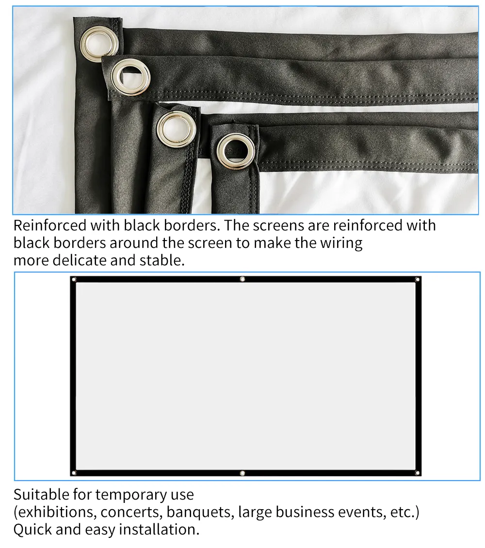 The screen is made from a durable, high-quality fabric that enhances the viewing experience by providing a smooth, even surface for optimal light reflection. This ensures that you get the best picture quality with consistent brightness and clarity, free from wrinkles or distortions.
