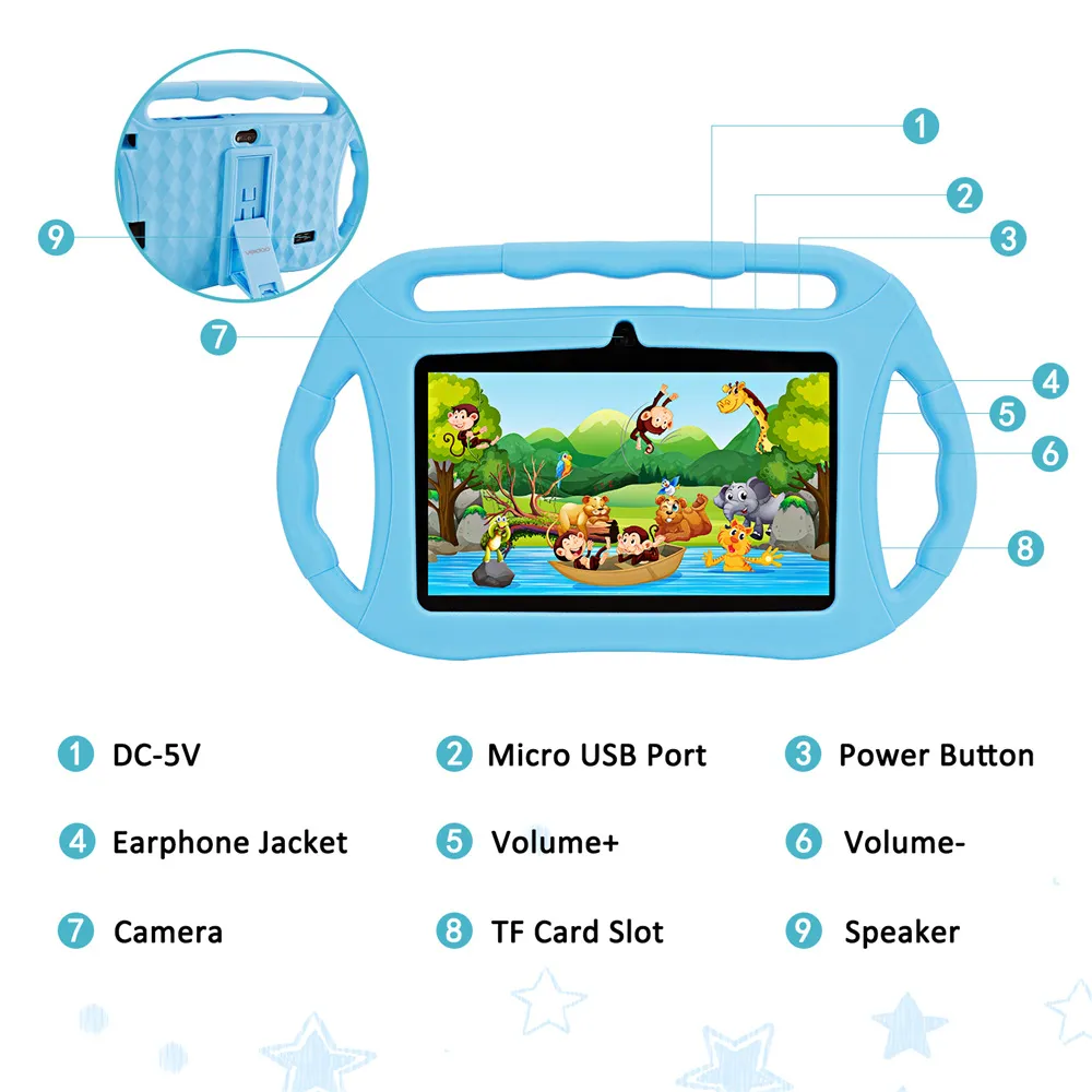 Equipped with a 7-inch HD display, this tablet delivers clear visuals while ensuring eye protection with low blue light technology. Its parental control settings allow guardians to manage screen time and content access, ensuring a safe online environment. With a durable, shockproof case, it's built to withstand everyday drops and bumps—perfect for little hands!