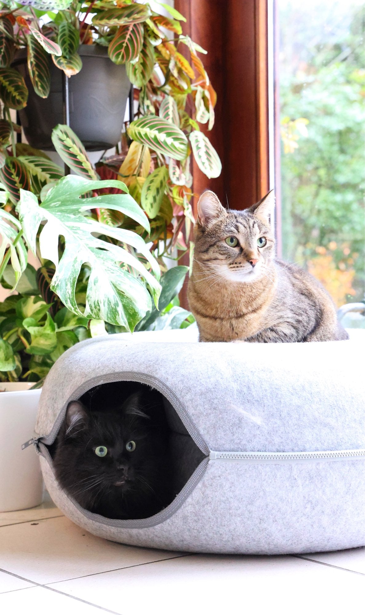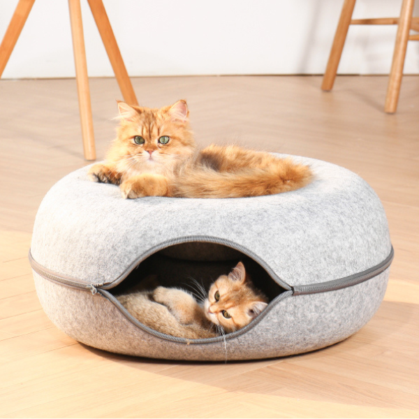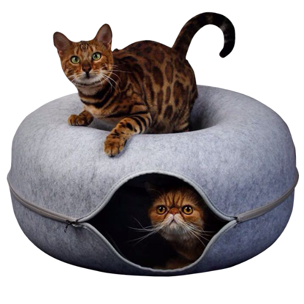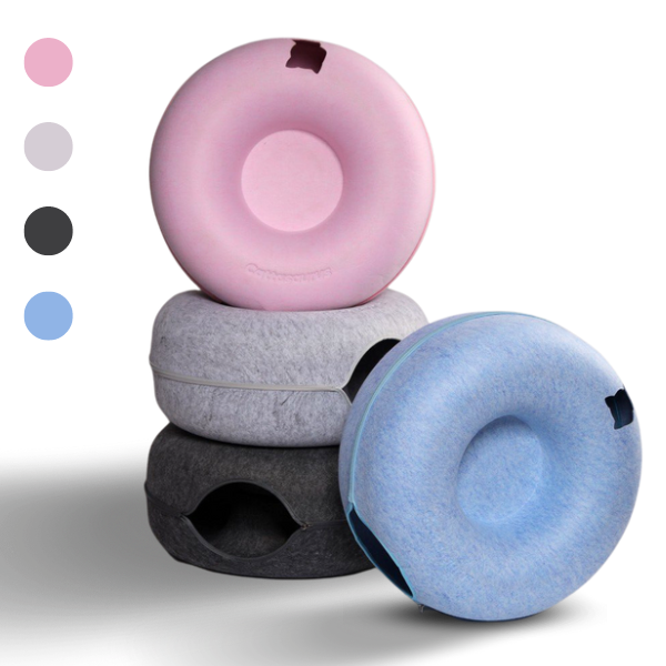 The Peekaboo Cat Cave's unique donut shape offers a hidey-hole bed in the center and a spacious, cozy tunnel surrounding it, providing your