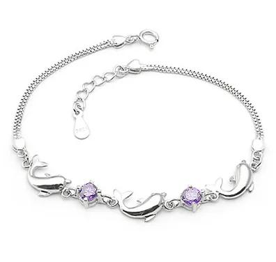 925 Sterling Silver Bracelet Wholesale, Dolphin Amethyst Bracelet, Women's Short Silver Jewelry