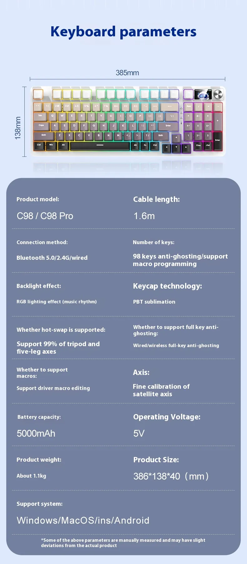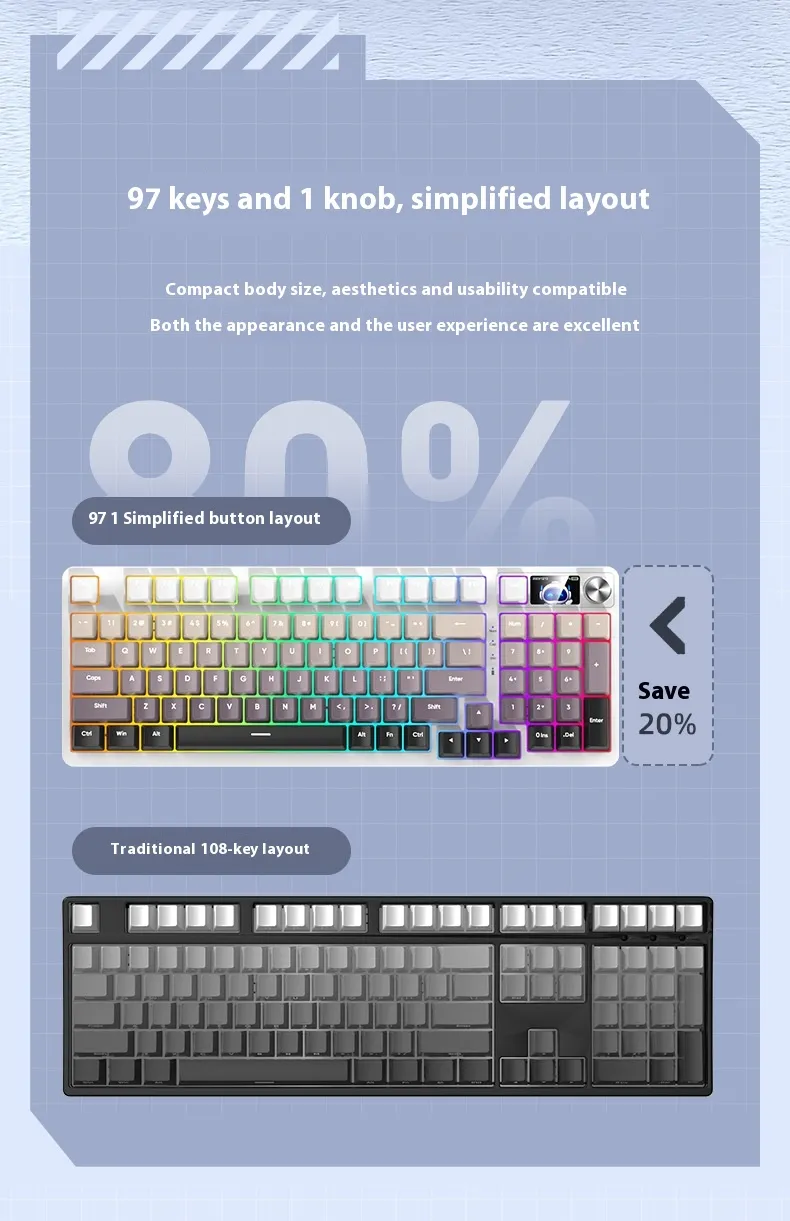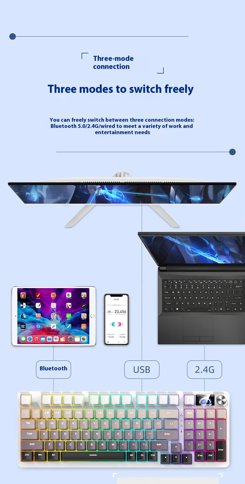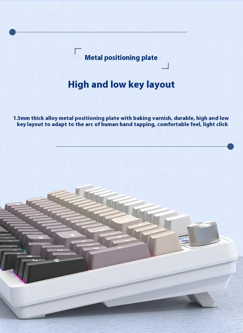 Equipped with three connectivity modes, including Bluetooth and wired options, it allows users to switch between devices effortlessly. Its mechanical-style keys provide tactile feedback for a comfortable typing experience, while the compact 98-key layout saves desk space without compromising functionality.