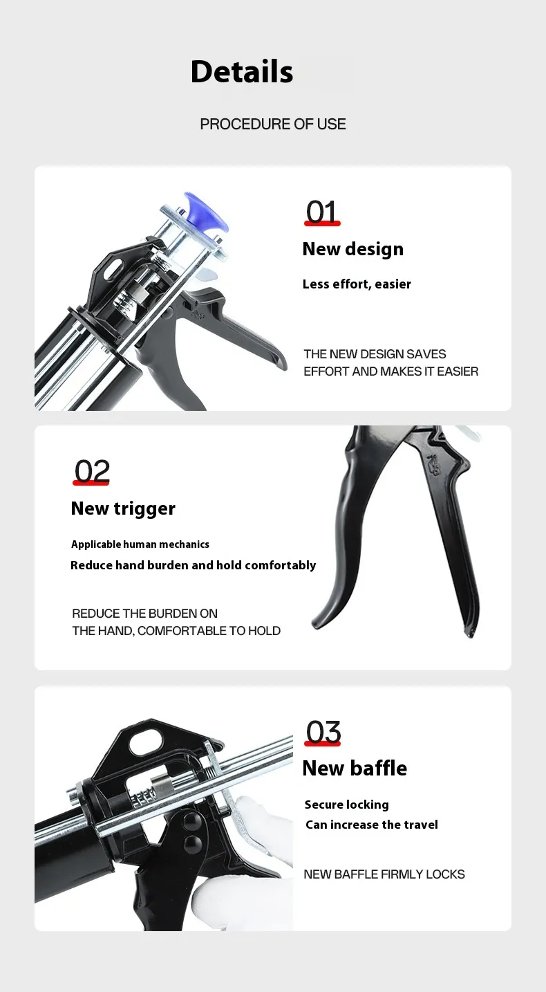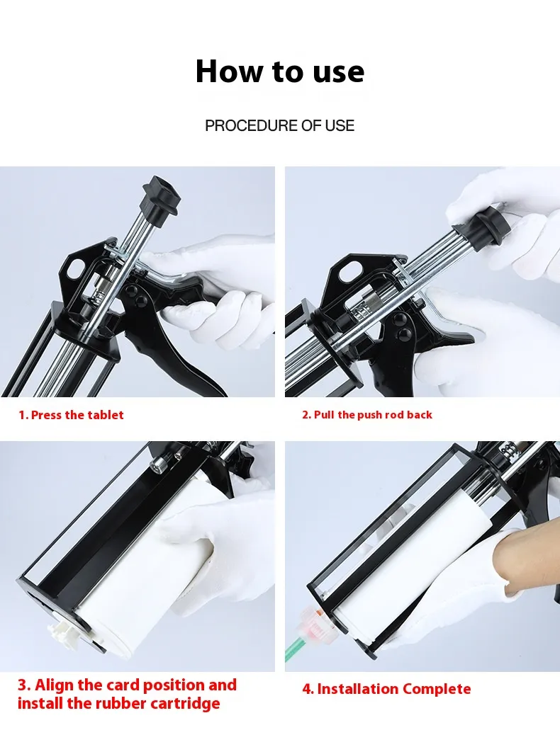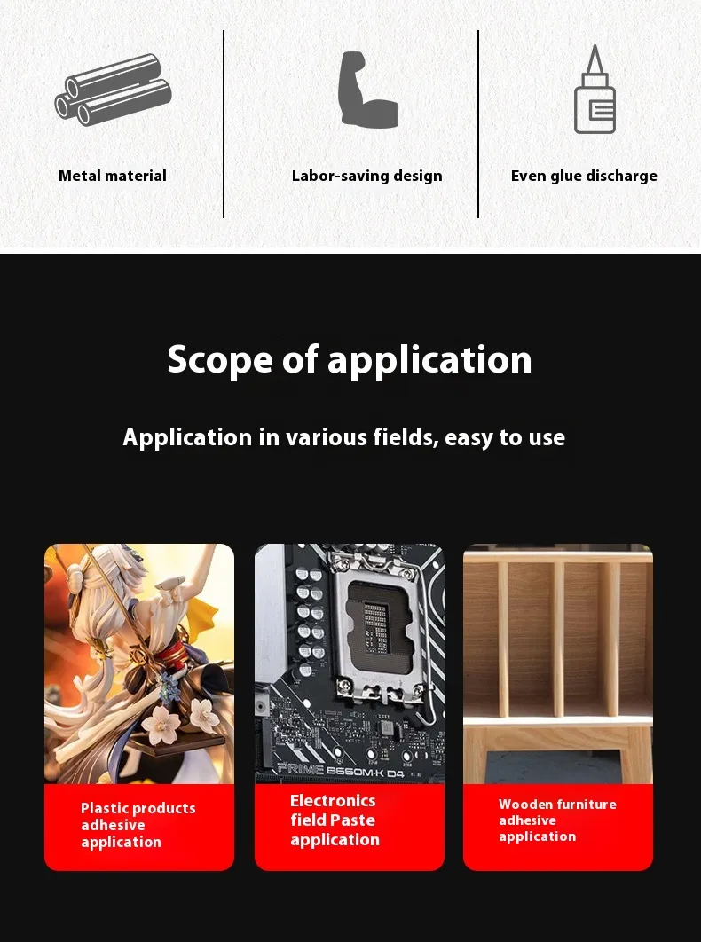 Built with a full metal housing, the applicator features a reinforced handle and push mechanism that offers stable performance even under frequent use. The manual control provides smooth and consistent pressure, ensuring precise mixing and minimal waste during the bonding process. Whether you're assembling electronic components, repairing furniture, or bonding plastic and metal surfaces, this tool guarantees a secure and clean application.