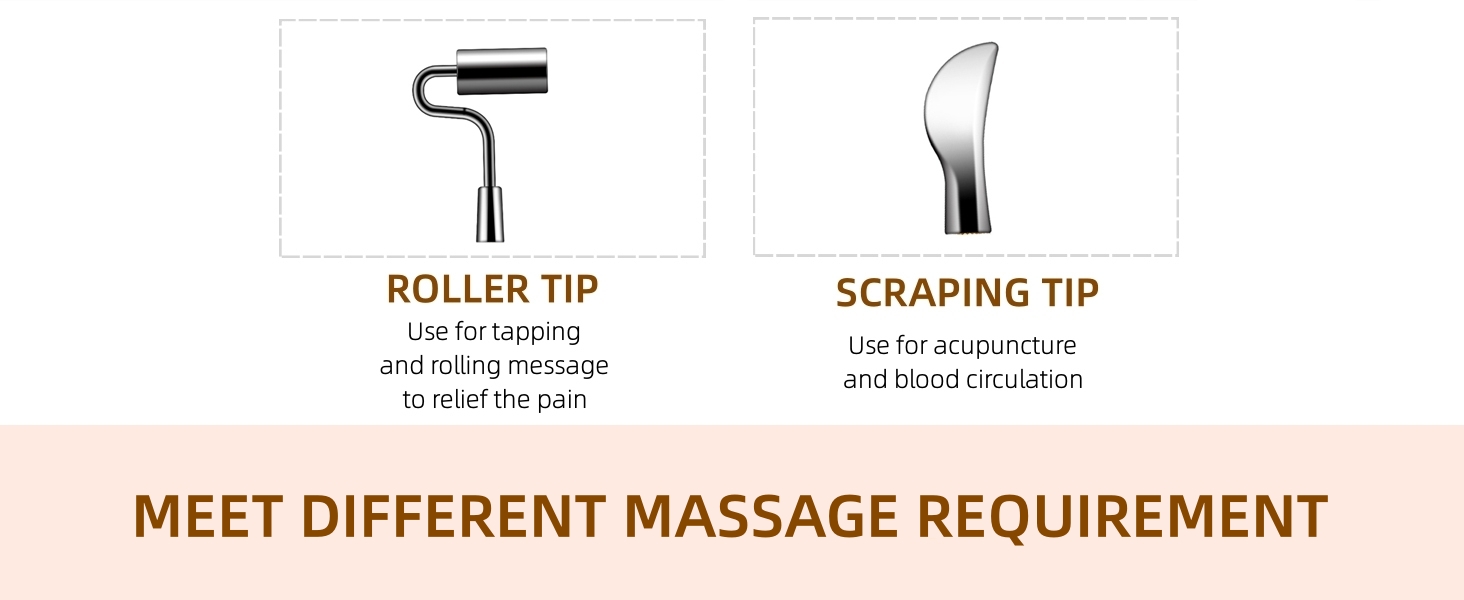 - Five Massage Heads: Node Type: Node therapy, which is applicable for partial body pains. Spheroidal Type: Partial therapy, which is applicable for quickly alleviating pain. Scraping Type: Scrapping therapy, which is applicable for acupuncture and blood circulation. Dome Type: Superficial therapy, which is applicable for health care and facial beauty. Acupuncture Tapping: Body therapy which is applicable for tapping and rolling massage to relief the pain.