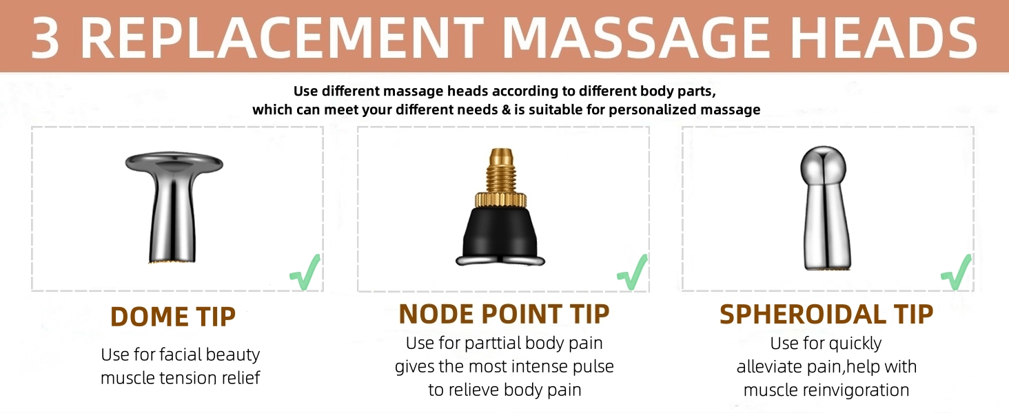 - The dome shape head can quickly alleviate pain and help with muscle reinvigoration; the spheroidal shape head provides soft massage for muscle tension relief; and the node head gives the most intense pulse to relieve body pain.