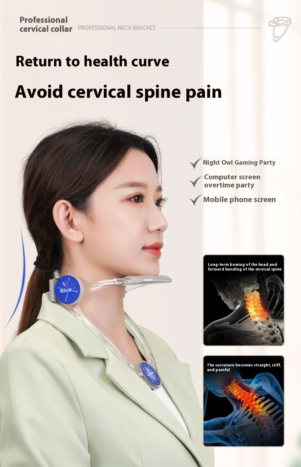 Supports proper cervical alignment, which can help correct poor posture caused by prolonged sitting, screen use, or repetitive strain.