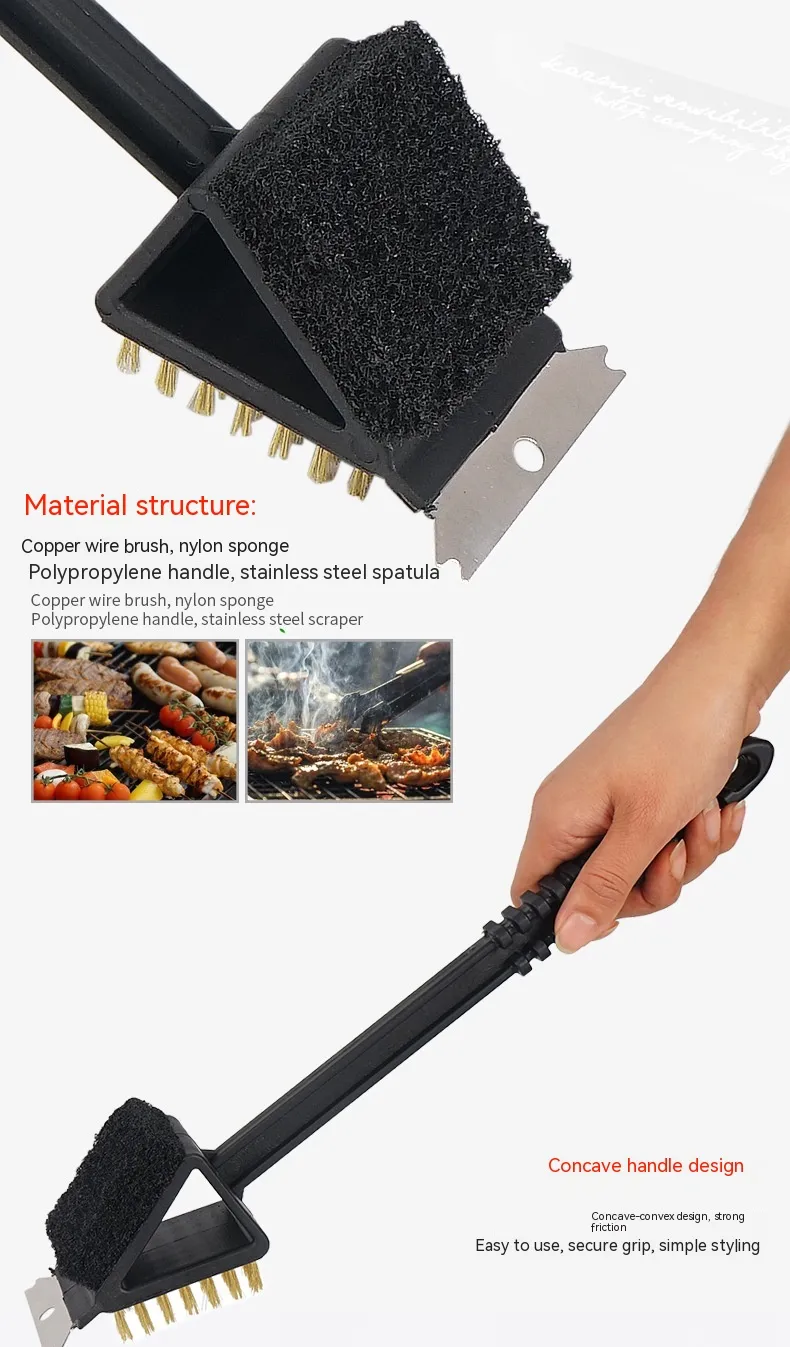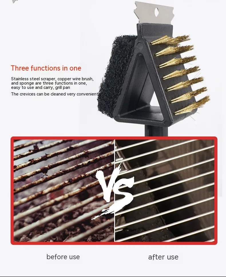 3-in-1 grill long handle cleaning brush, copper wire brush, small scraper, quick grill cleaning tool.