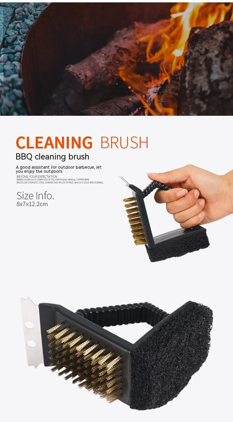 3-in-1 grill long handle cleaning brush, copper wire brush, small scraper, quick grill cleaning tool.