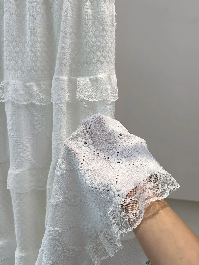 Crafted with attention to detail, the dress offers a flattering fit that enhances the feminine silhouette, while the layered cake-style design adds volume and movement. The lace detailing brings a soft, airy texture, making it an enchanting choice for any occasion. Available in various sizes, this dress ensures that every woman can enjoy its chic design and timeless appeal.