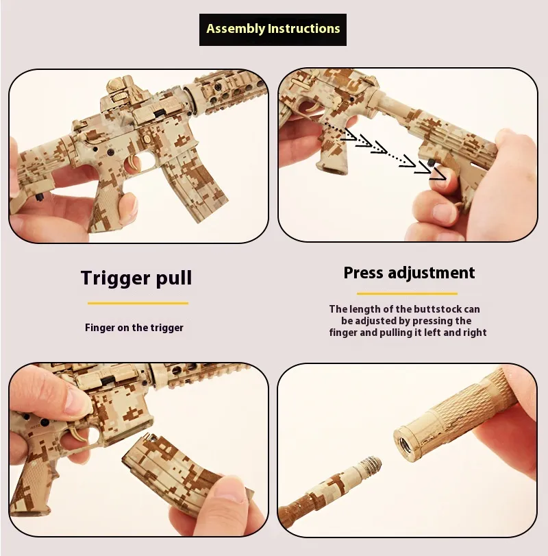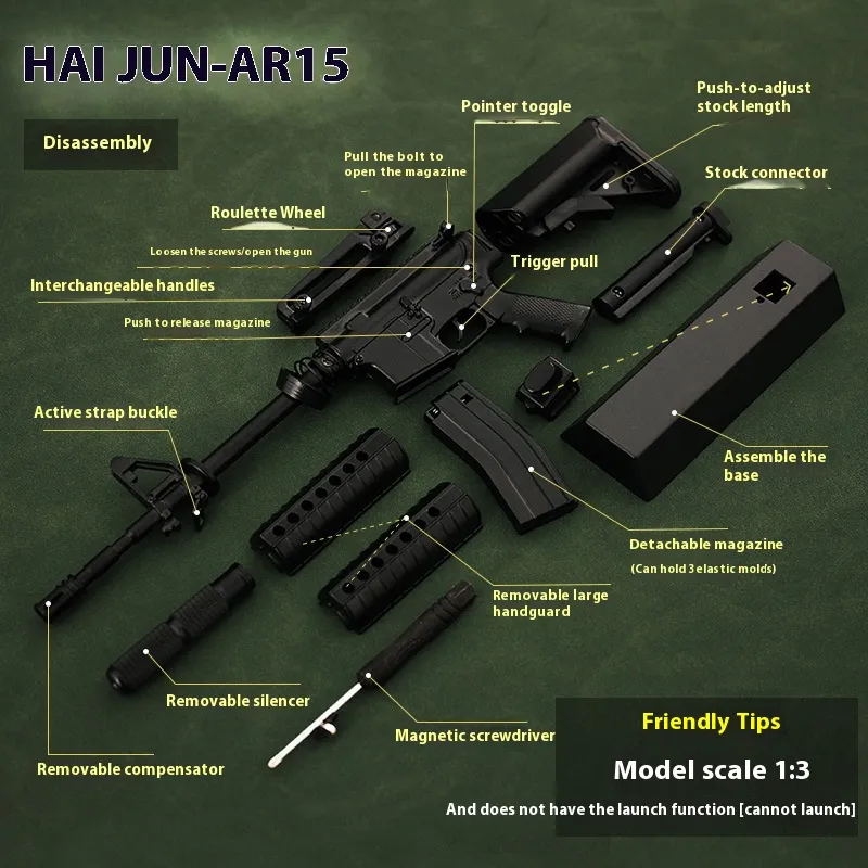 Made from durable alloy metal, the Alloy Military Model Detachable Metal Gun Toy is built to last. Its sturdy design not only offers a realistic look but also gives a substantial, authentic feel. This model toy gun replicates real military firearms with precision, from the design of the barrel to the details of the trigger and magazine. The alloy construction ensures durability, while the attention to detail makes it a standout piece for any military model collection.