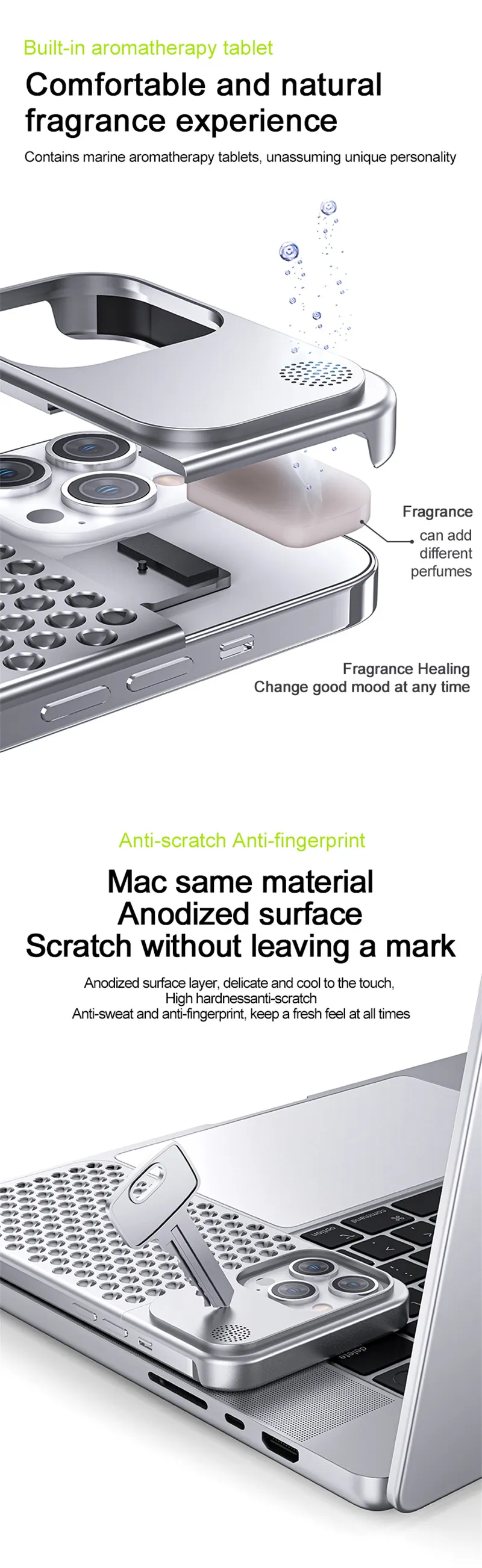 Aluminum alloy mobile phone case with a simple body and a fragrance tablet to obtain a longer-lasting elegant fragrance while using the