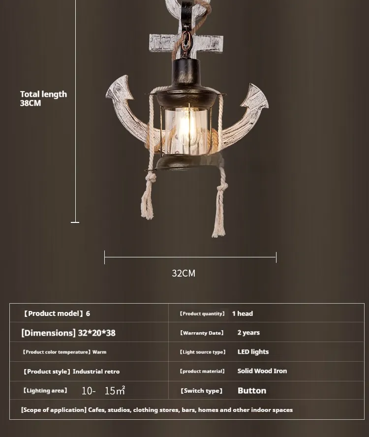 The American Creative Industrial Style Retro Wall Lamp with a Boat Anchor Solid Wood Distressed Lamp design combines nautical charm with industrial style, making it a distinctive addition to any interior. Perfect for creating a coastal-inspired atmosphere or adding an industrial edge to your decor, this wall lamp features a unique boat anchor design that incorporates both rustic solid wood and vintage metal accents. The distressed finish and warm Edison bulb bring a sense of history and character to your space.