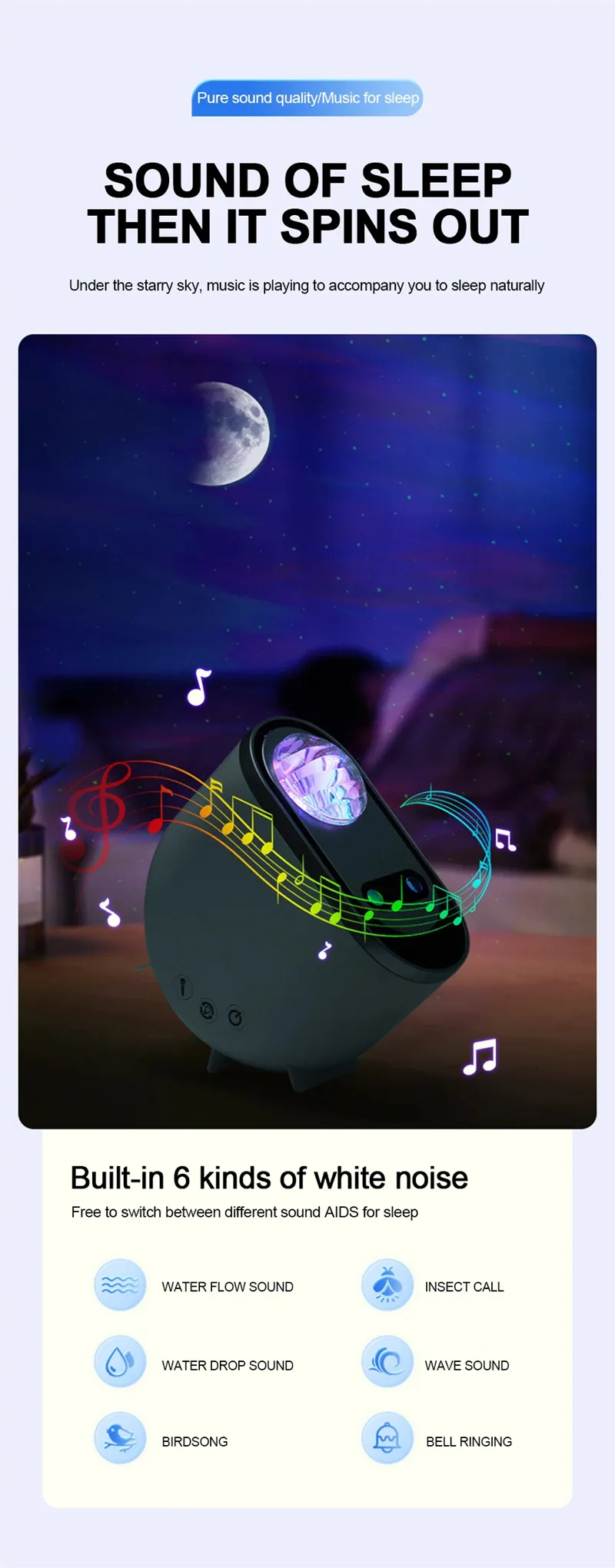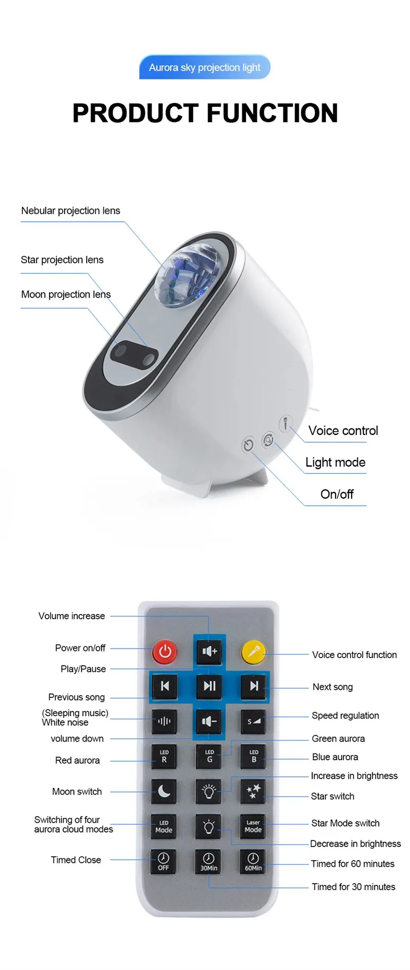brightness adjustable), and the timer function, which can be set for 30 minutes, 1 hour, and time off. External sound sensing rhythm