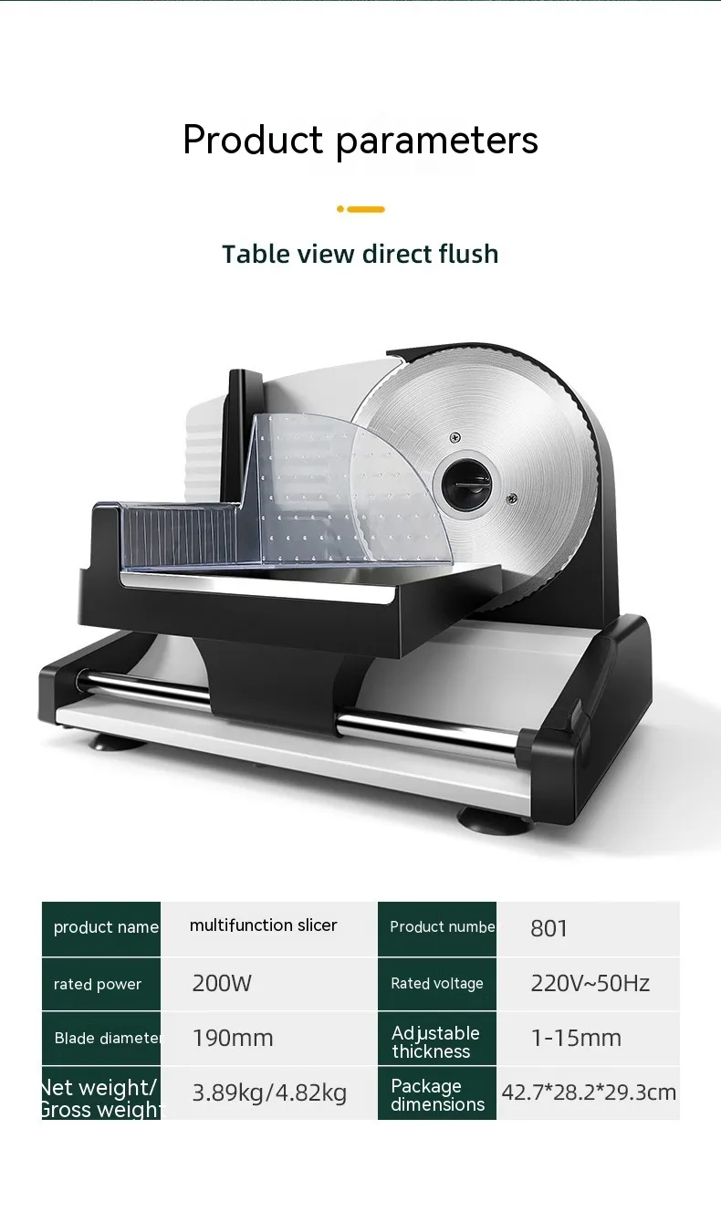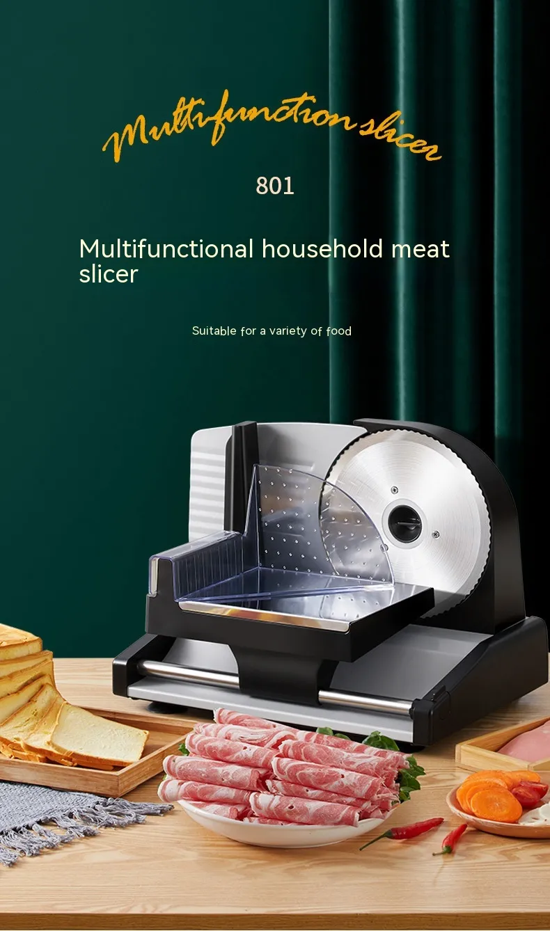 Featuring adjustable slicing thickness, the Automatic Home Use Slicer ensures that you can customize the thickness of your slices to suit your specific needs—whether you prefer thin, medium, or thick slices of bread or lamb roll. Its user-friendly design and powerful motor ensure smooth, consistent results with minimal effort. The slicer is perfect for home chefs who want to save time and achieve consistent slicing for sandwiches, roasts, or other culinary creations.