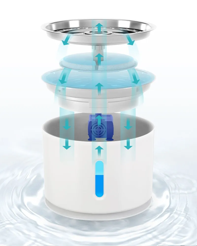 3. Circulation filtration system: The circulation filtration system uses a replaceable round filter to purify water and remove hair, dirt and food particles. The circular filter is made of multiple layers of cotton, coconut-activated carbon and ion exchange resin. It provides fresh, clean water for your cute pets.