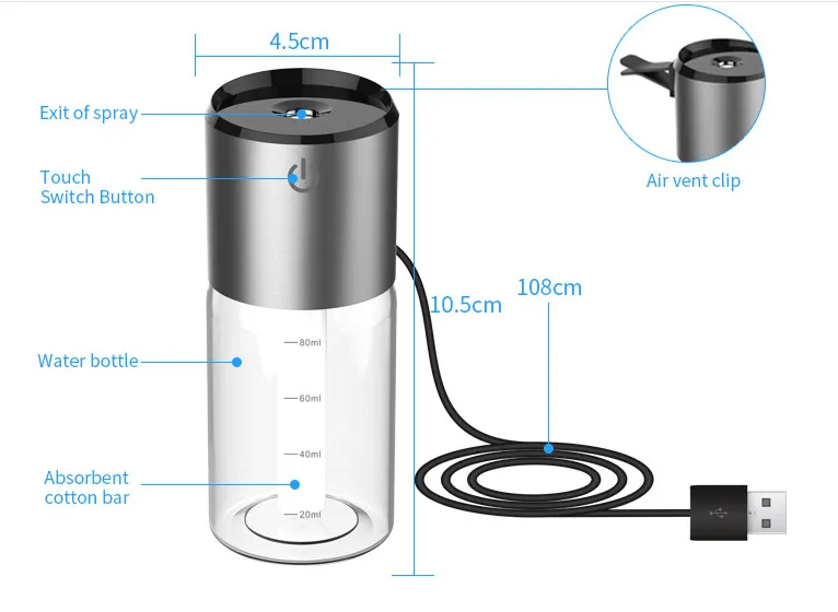 The Automobile Aromatherapy Humidifier serves two primary functions: moisturizing the air and diffusing your favorite scents. As a humidifier, it helps prevent dry air, which can lead to discomfort, dry skin, or irritated sinuses, especially during colder months or air-conditioned environments. As an aromatherapy diffuser, it lets you add a touch of relaxation to your car by using essential oils, helping to relieve stress, boost your mood, or energize you during long drives. Simply add a few drops of your preferred essential oil to the humidifier for an aromatic experience as you drive.